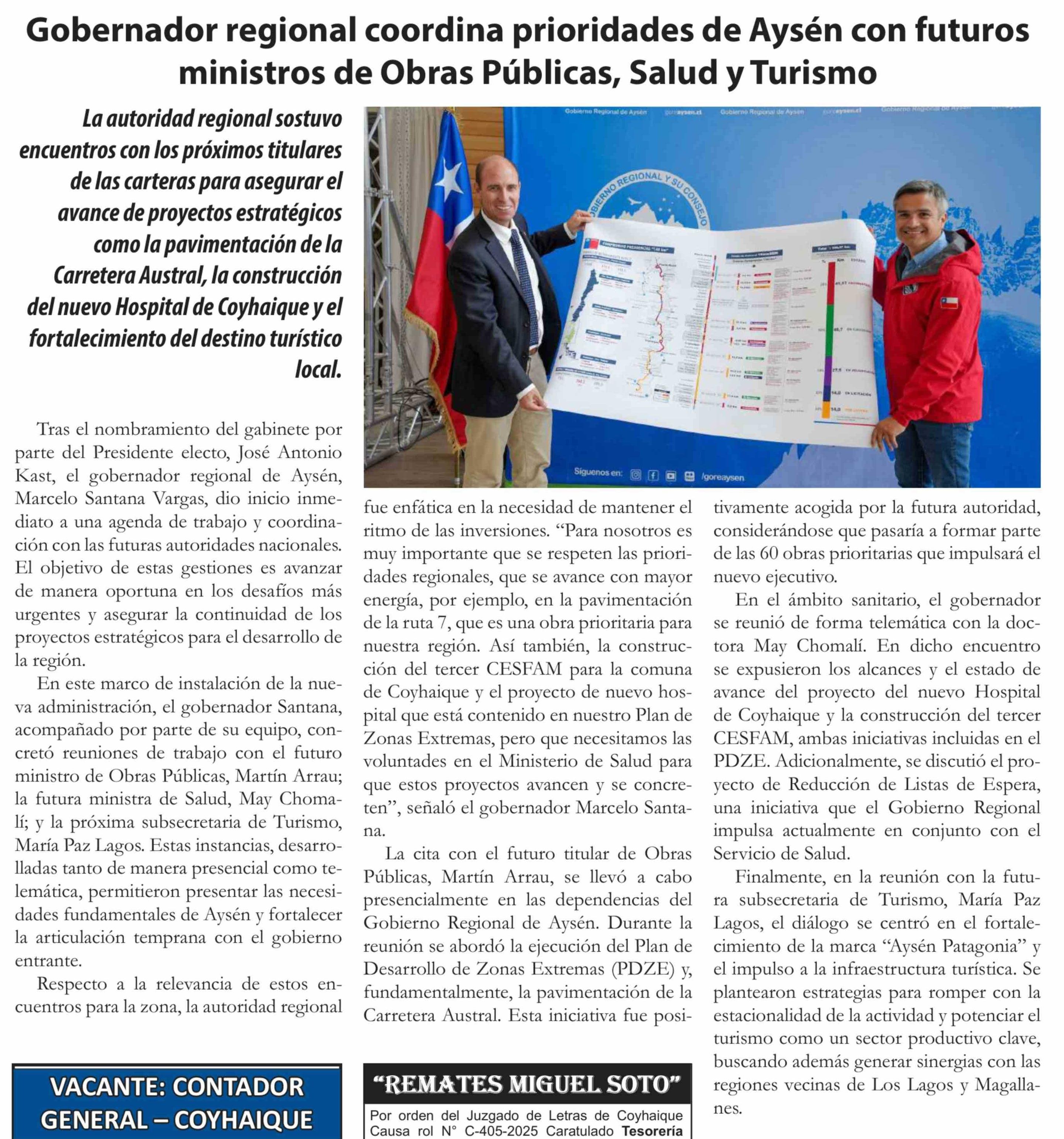 Título: Gobernador regional coordina prioridades de Aysén con futuros ministros de Obras Públicas, Salud y Turismo