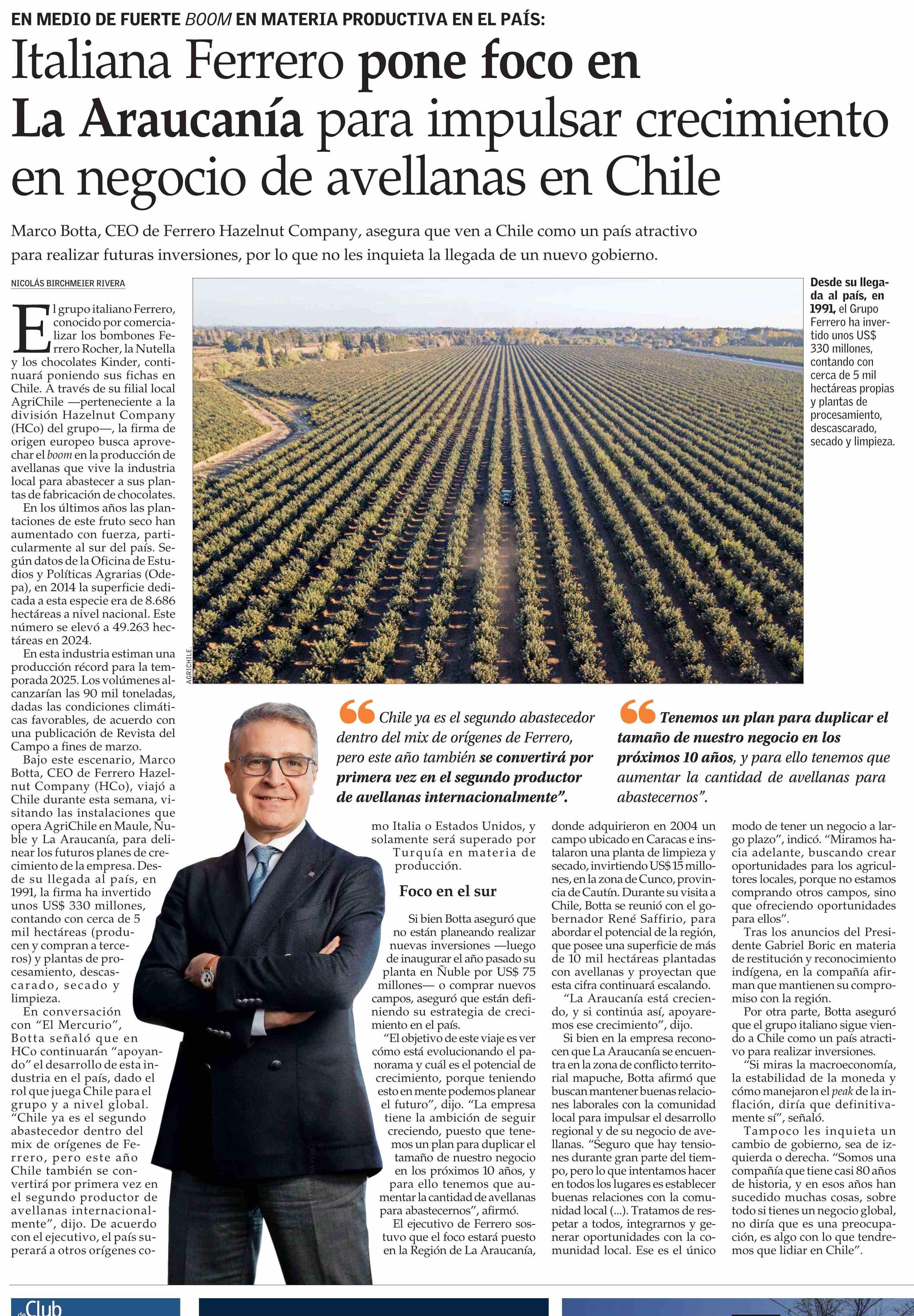 Italiana Ferrero pone foco en La Araucanía para impulsar crecimiento en negocio de avellanas en Chile 24-05-2025 El Mercurio |