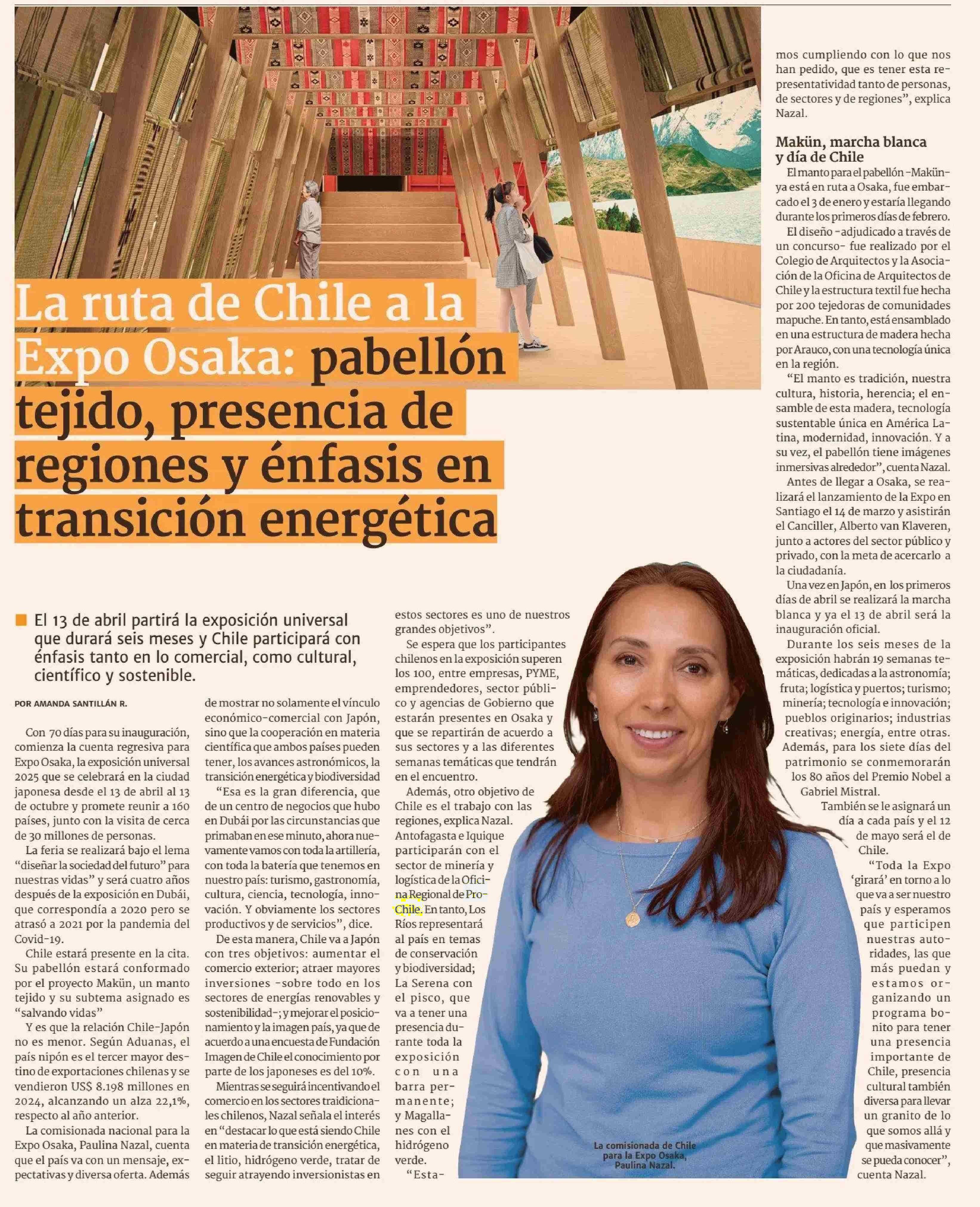 La ruta de Chile a la Expo Osaka: pabellón tejido, presencia de regiones y énfasis en transición energética 03-02-2025 Diario Financiero |
