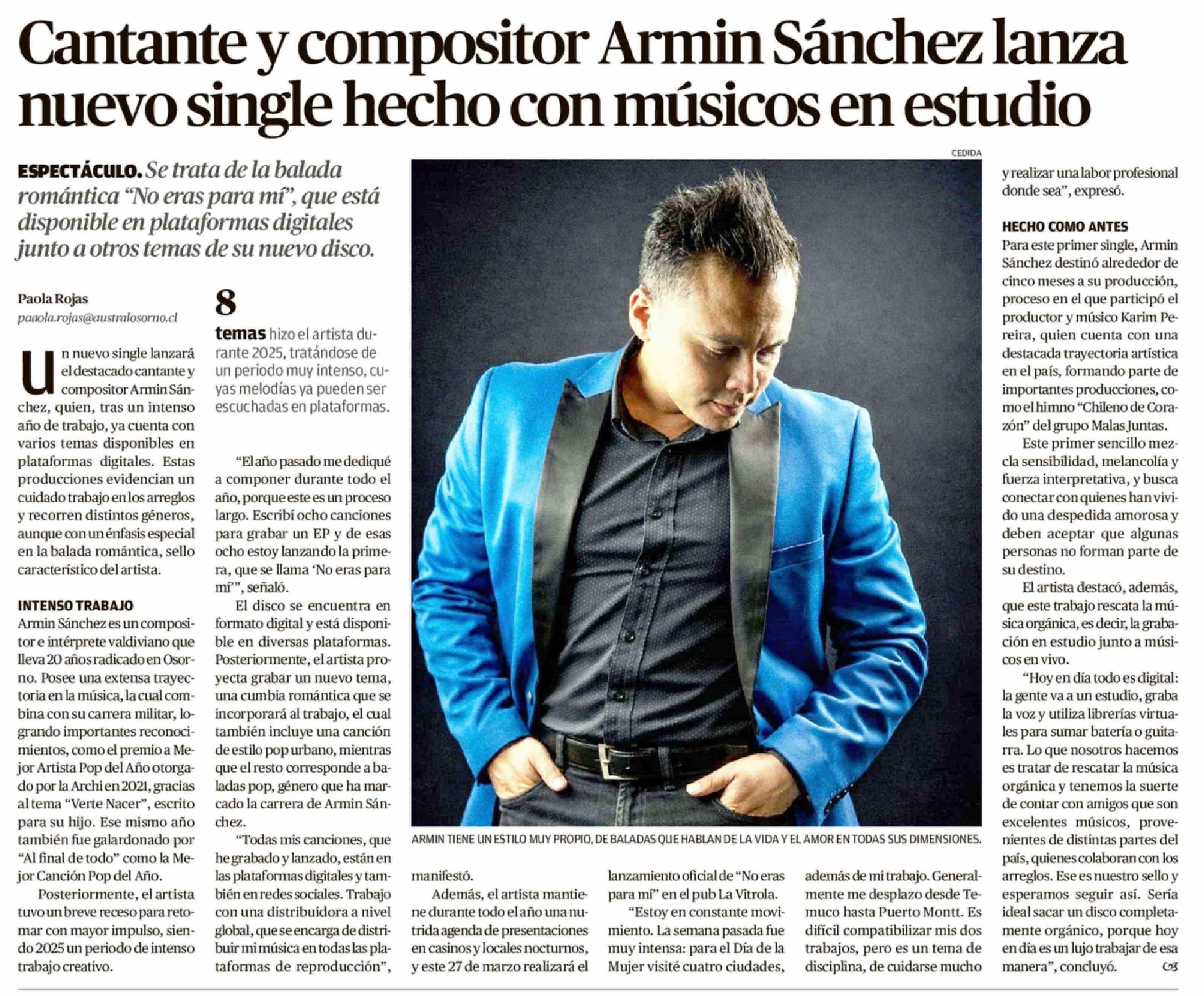 Título: Cantante y compositor Armin Sánchez lanza nuevo single hecho con músicos en estudio