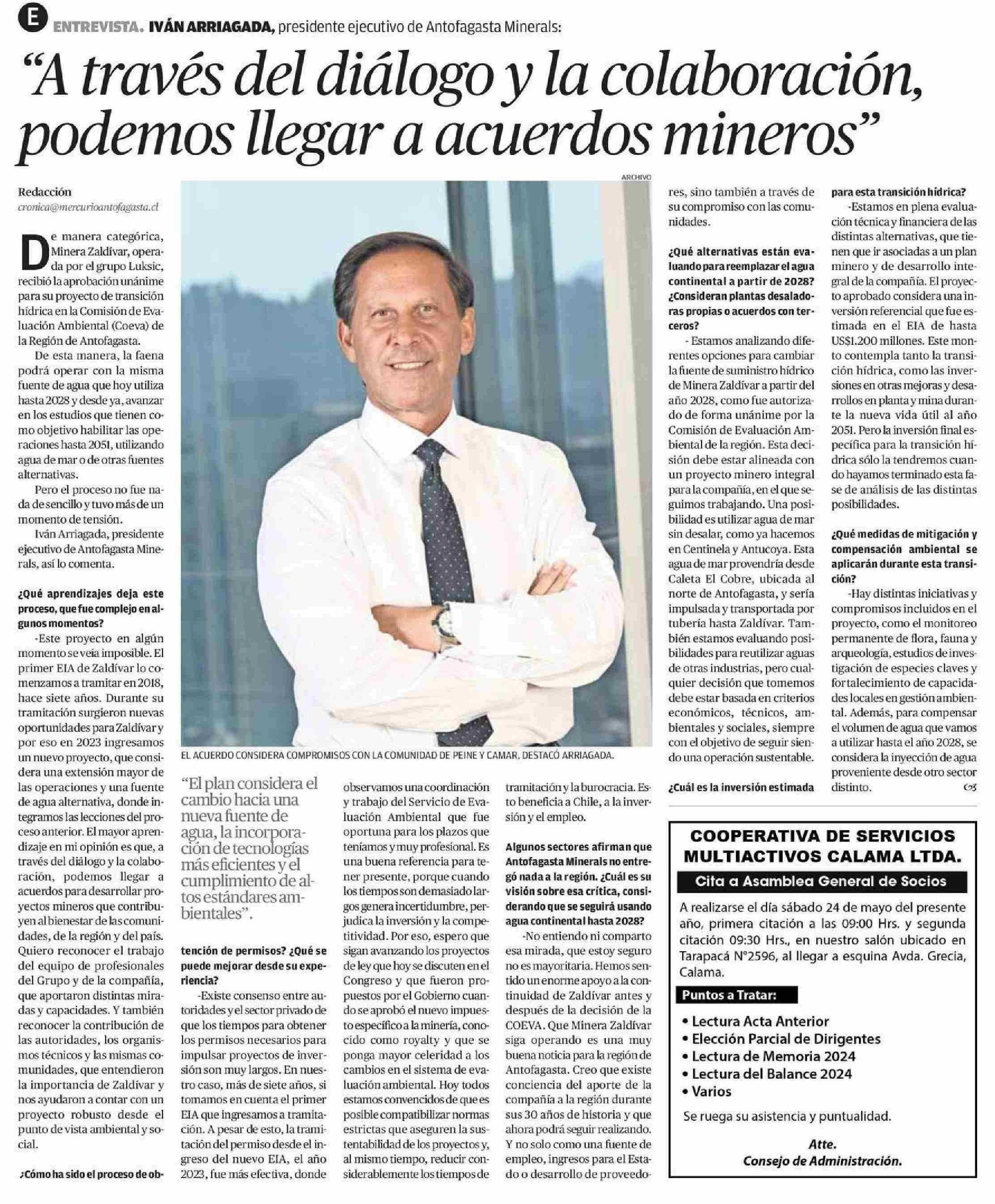 “A través del diálogo y la colaboración, podemos llegar a acuerdos mineros” 18-05-2025 El Mercurio de Antofagasta |