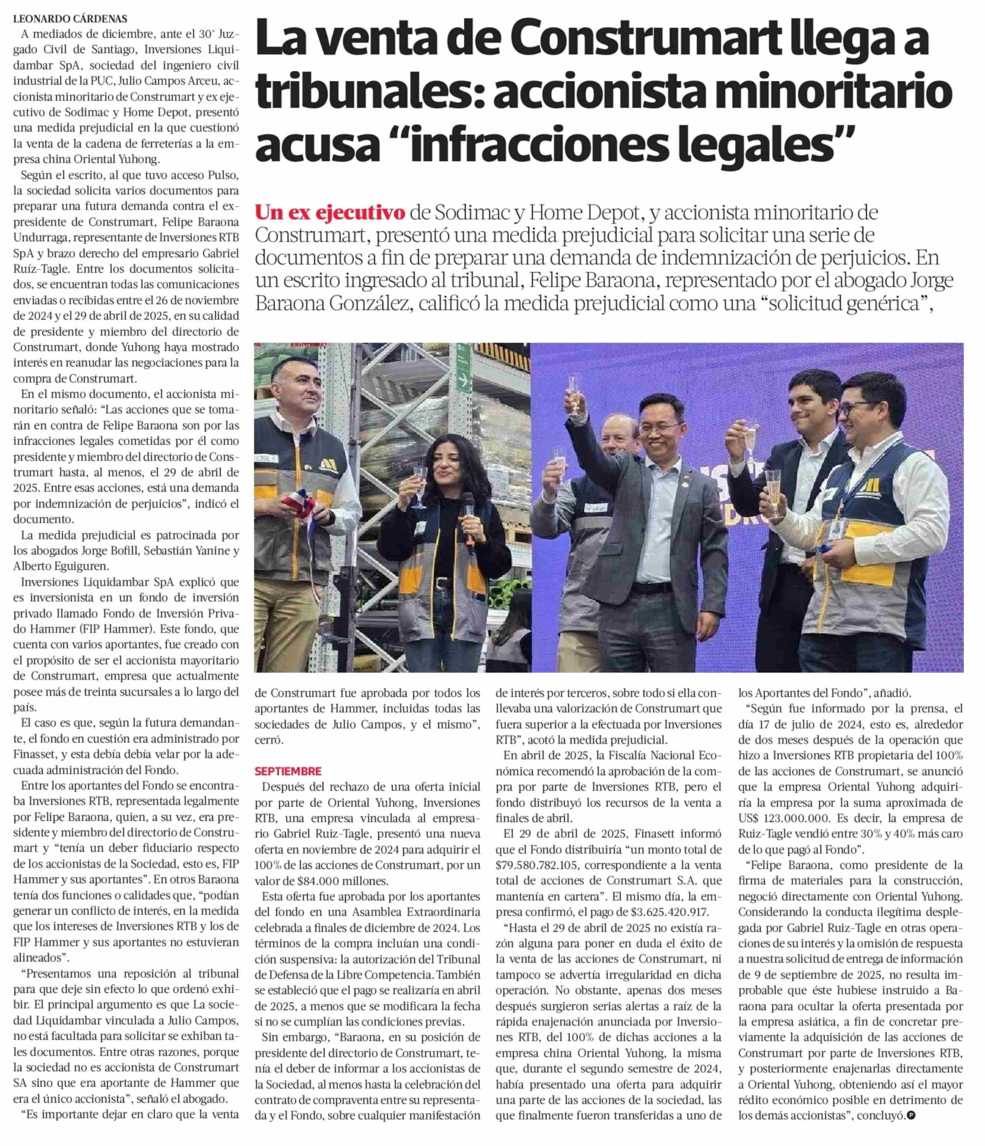 La venta de Construmart llega a tribunales: accionista minoritario acusa "infracciones legales" 21-01-2026 La Tercera |