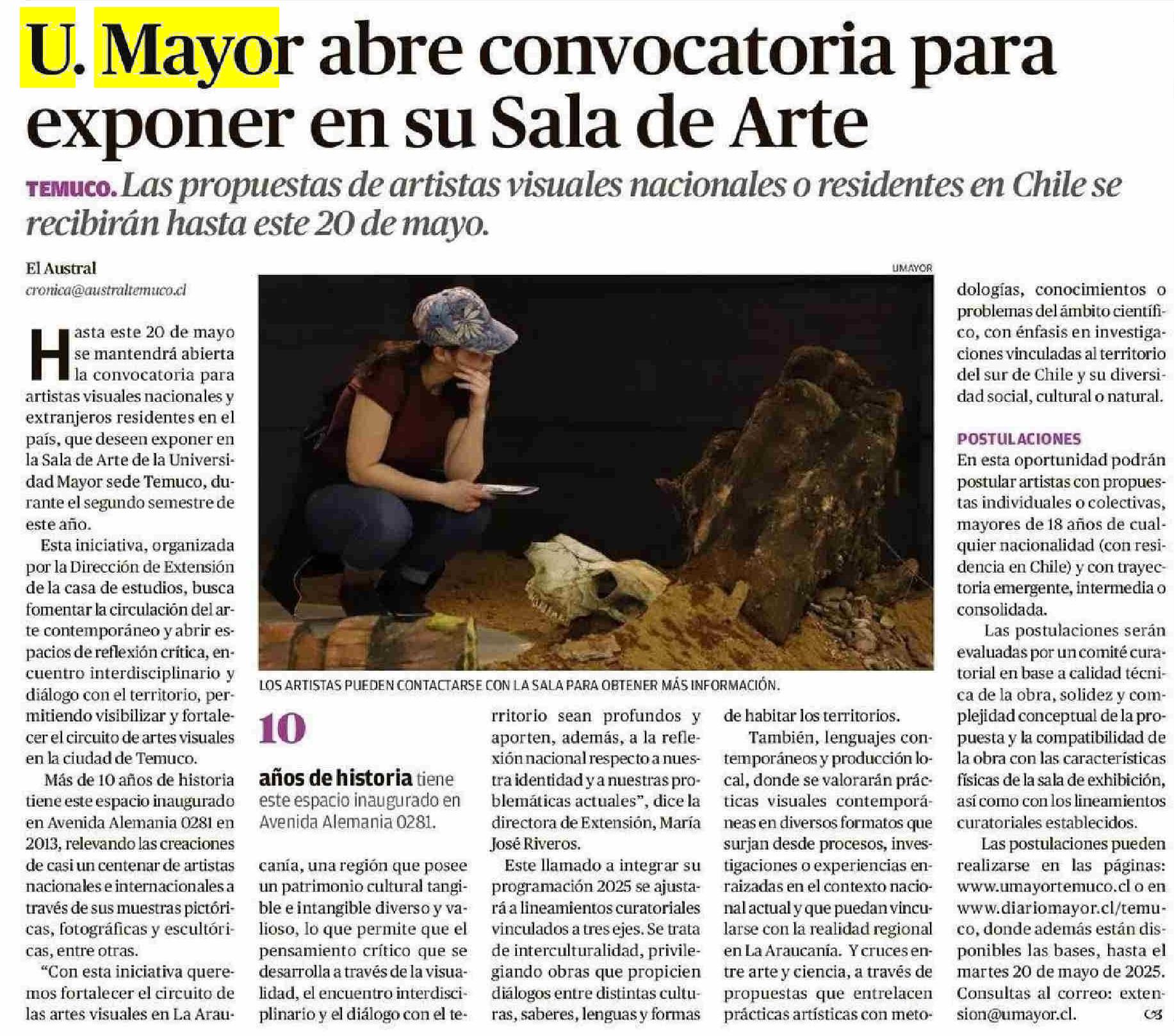 U. Mayor abre convocatoria para exponer en su Sala de Arte 13-05-2025 El Austral de la Araucanía |