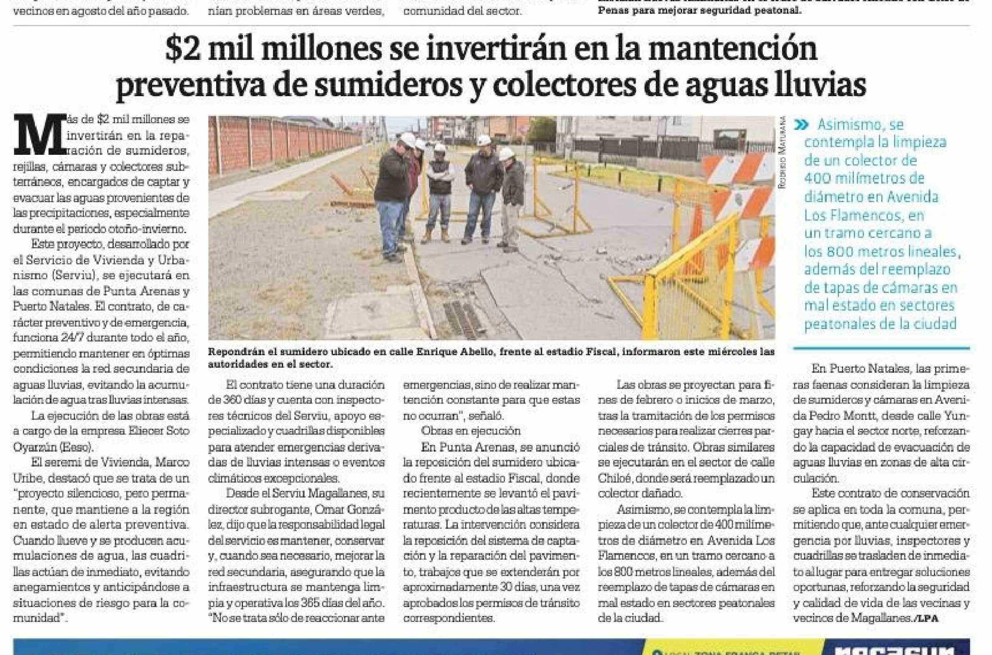 $2 Mil millones se invertirán en la mantención preventiva de sumideros y colectores de aguas lluvias ROUHEID MATURANA 13-02-2026 La Prensa Austral |