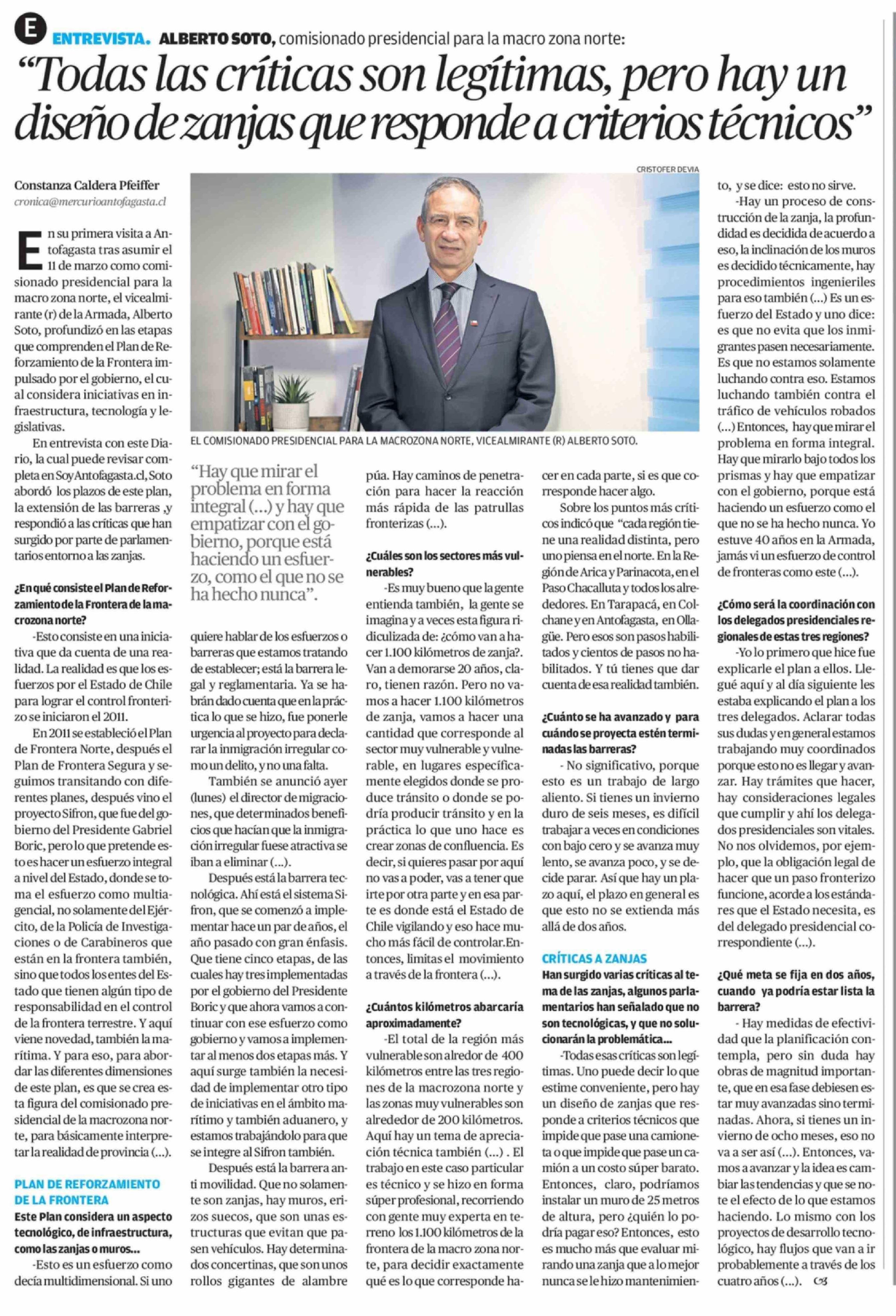 "Todas las críticas son legítimas, pero hay un diseño de zanjas que responde a criterios técnicos" 30-03-2026 El Mercurio de Antofagasta |