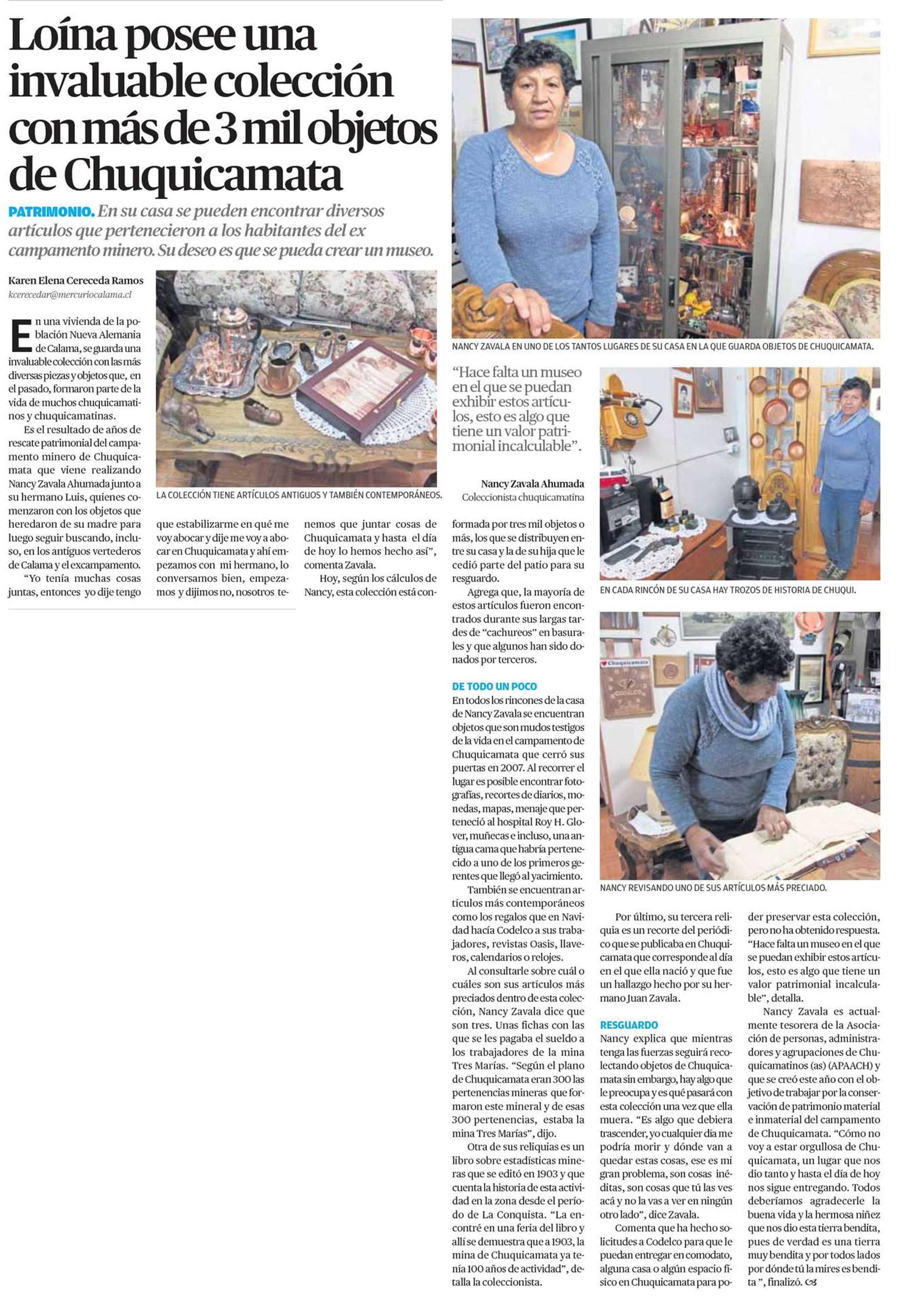 Loína posee una invaluable colección con más de 3 mil objetos de Chuquicamata 04-06-2021 El Mercurio de Calama |