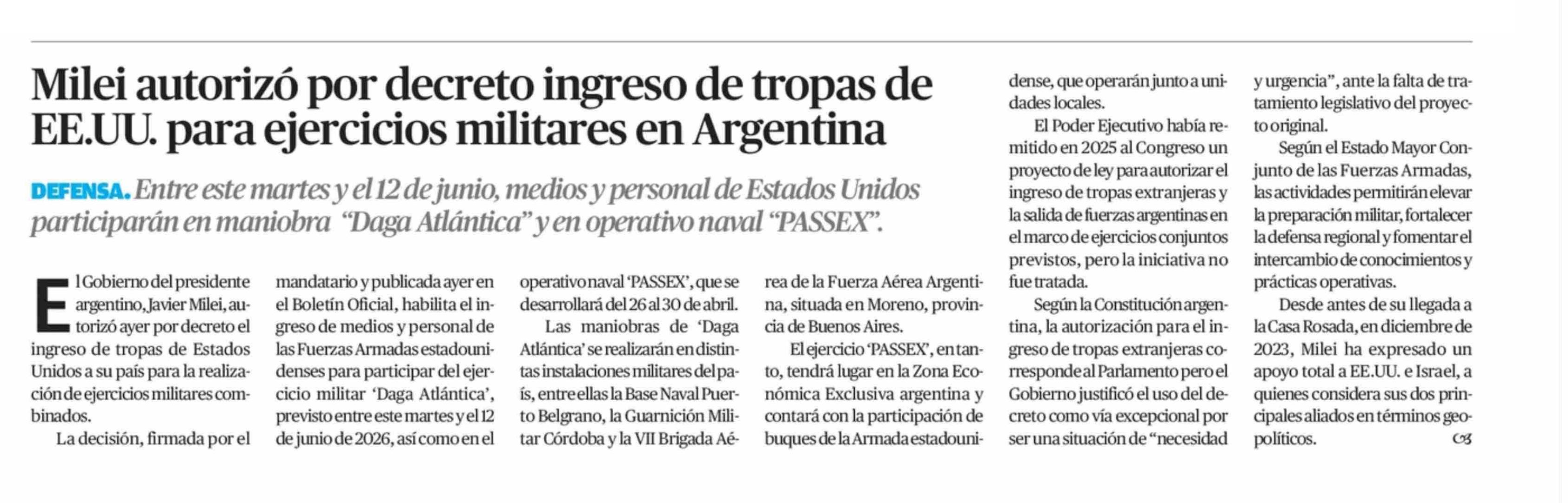 | Título: | Milei autorizó por decreto ingreso de tropas de EE.UU. para ejercicios militares en Argentina |