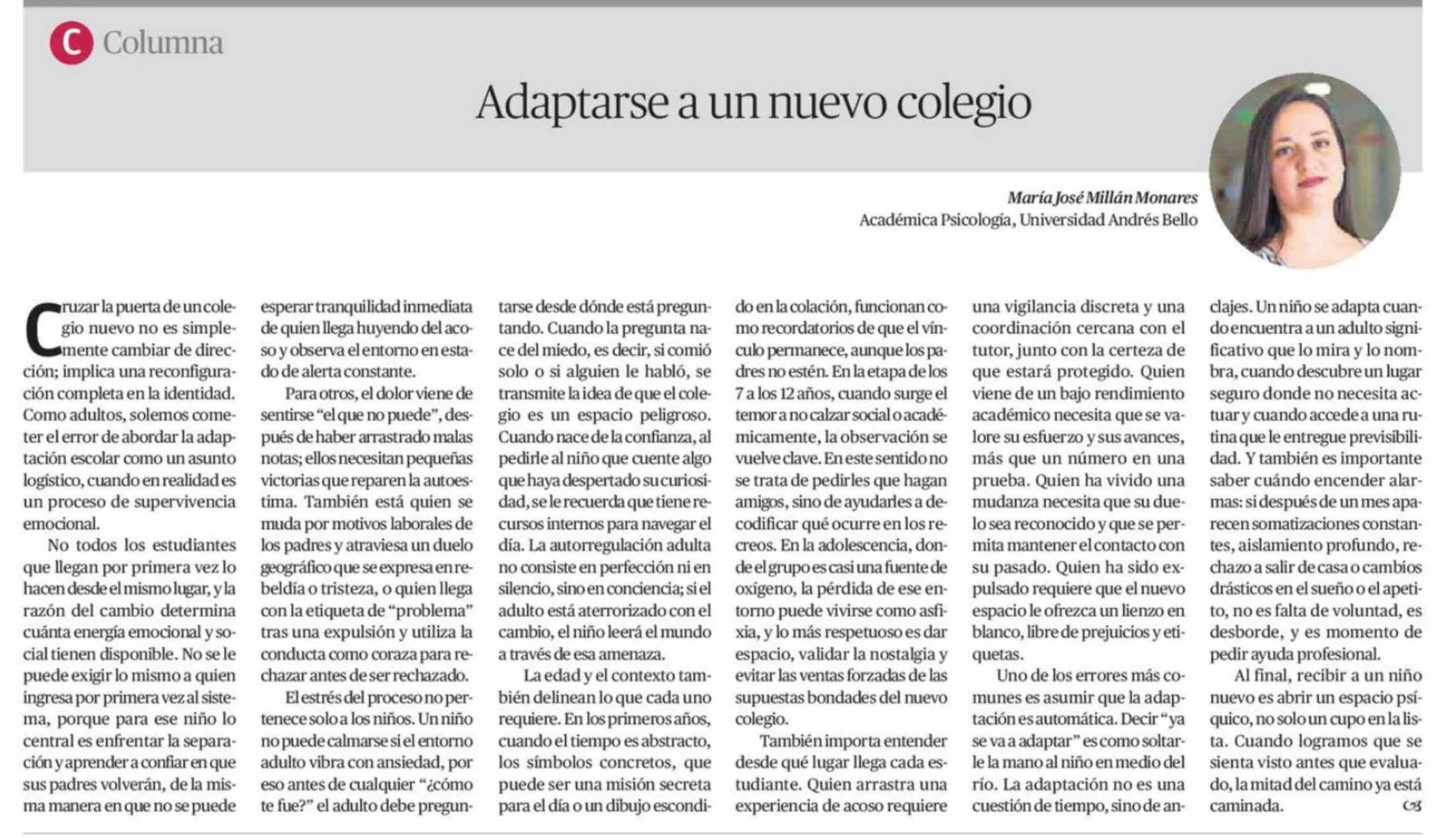 Columnas de Opinión: Adaptarse a un nuevo colegio 25-02-2026 El Mercurio de Calama |