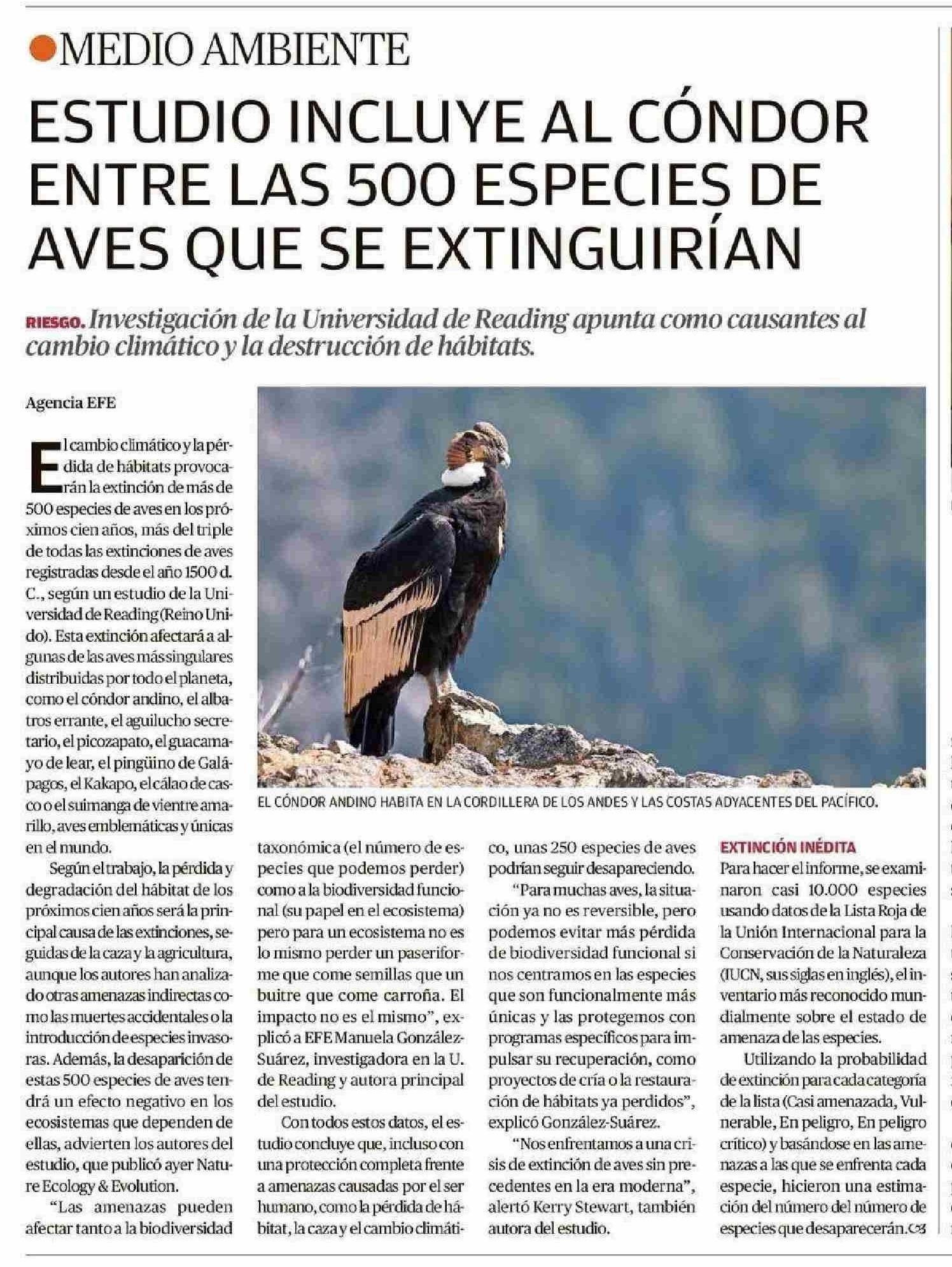 | Título: | ESTUDIO INCLUYE AL CÓNDOR AVES QUE SE EXTINGUIRÍAN ENTRE LAS 500 ESPECIES DE |