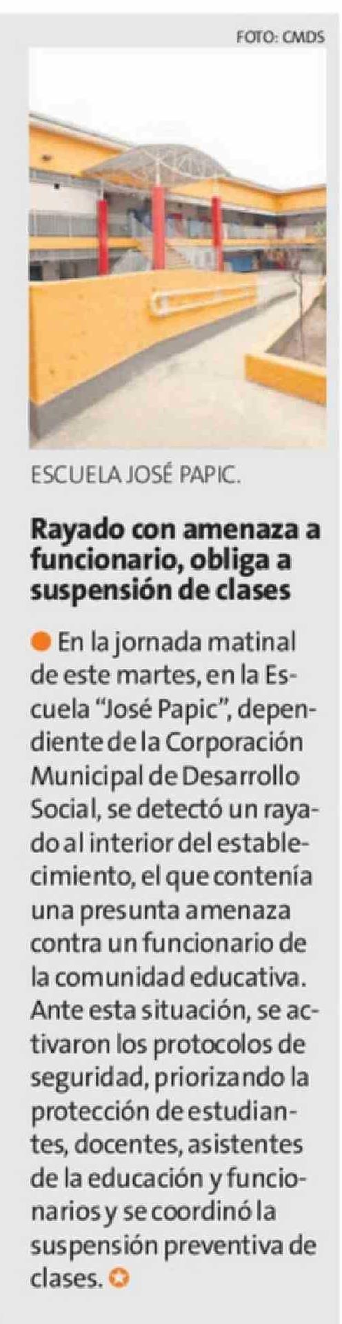 | Título: | Rayado con amenaza a funcionario, obliga a suspensión de clases |
