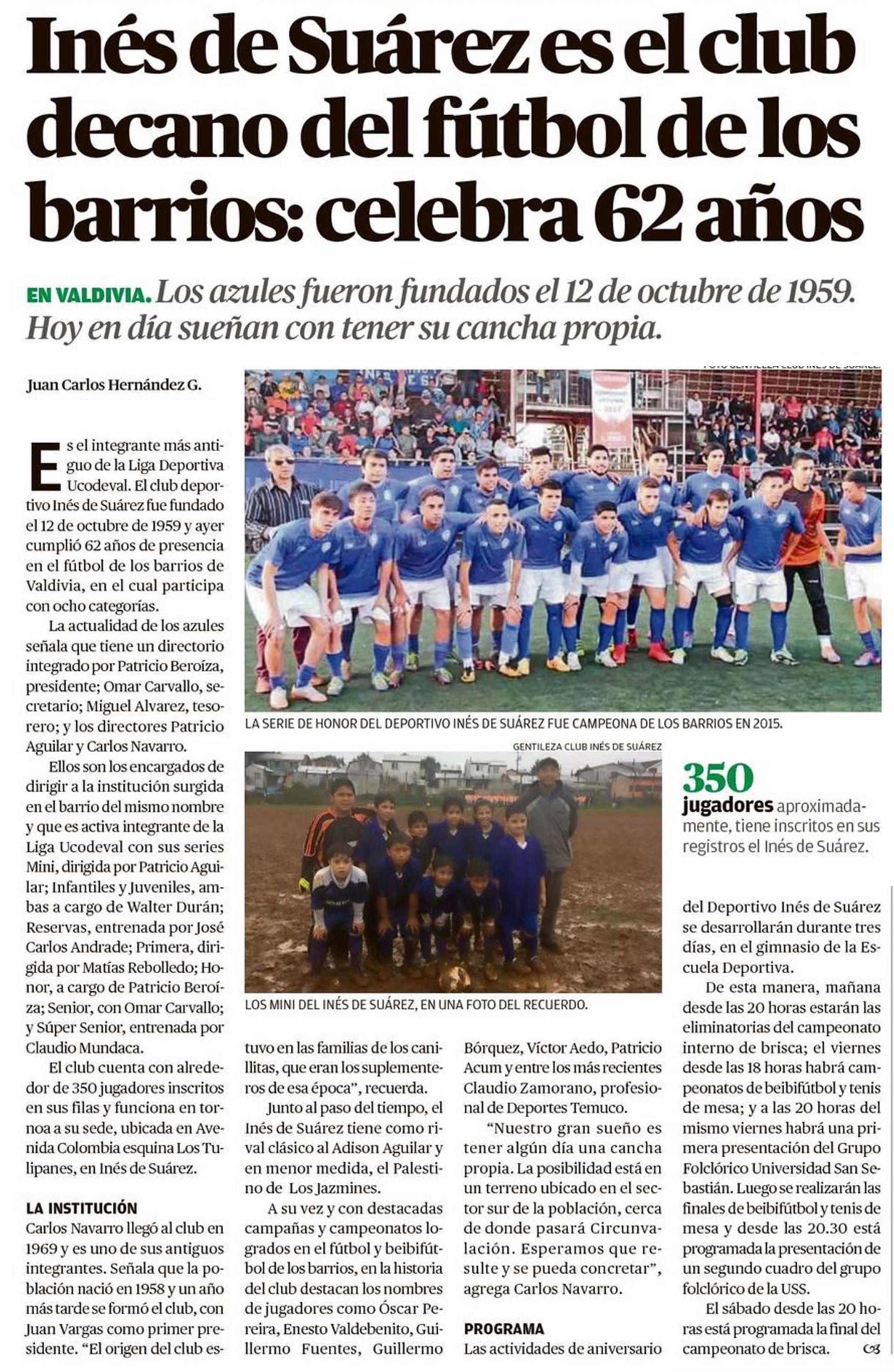 Inés de Suárez es el club decano del fútbol de los barrios: celebra 62 años 13-10-2021 Diario Austral Región de Los Ríos |