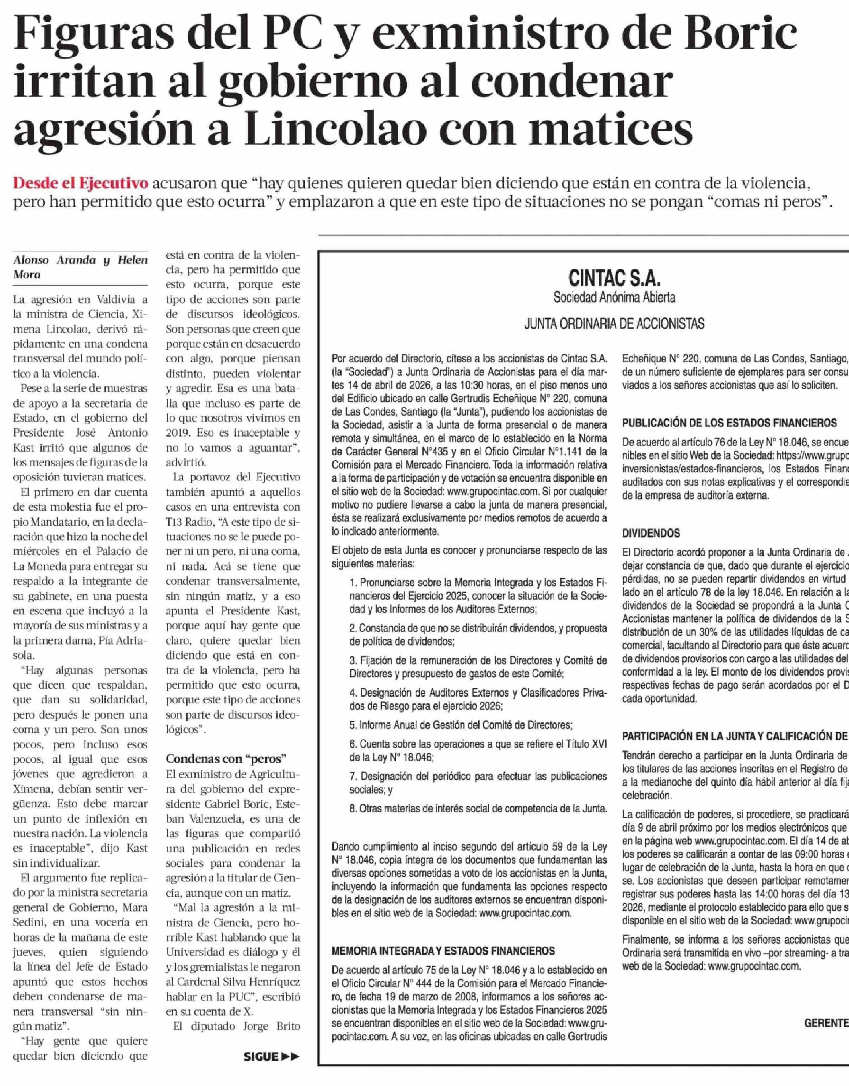 Figuras del PC y exministro de Boric irritan al gobierno al condenar agresión a Lincolao con matices 10-04-2026 La Tercera |