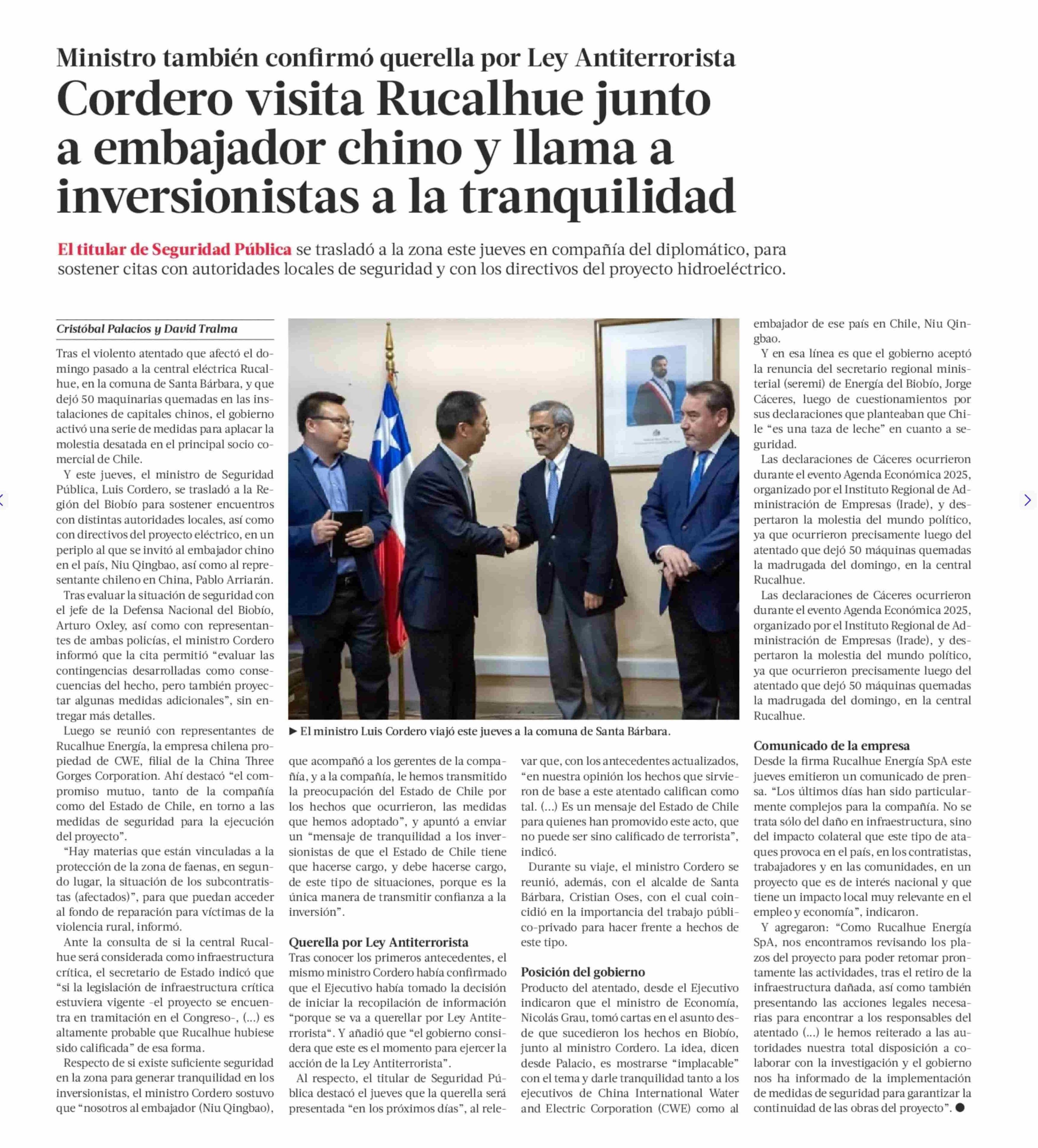 Cordero visita Rucalhue junto a embajador chino y llama a inversionistas a la tranquilidad 25-04-2025 La Tercera |
