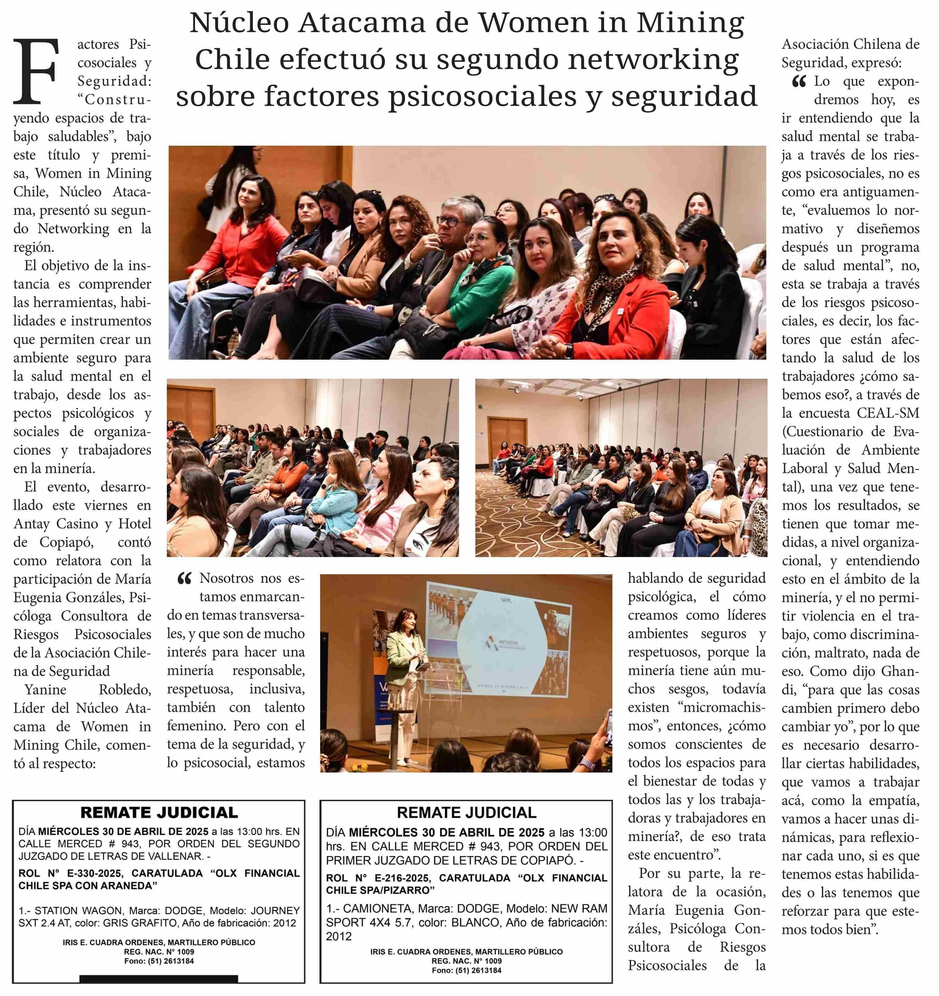 Núcleo Atacama de Women in Mining Chile efectuó su segundo networking sobre factores psicosociales y seguridad 26-04-2025 Diario Chañarcillo |