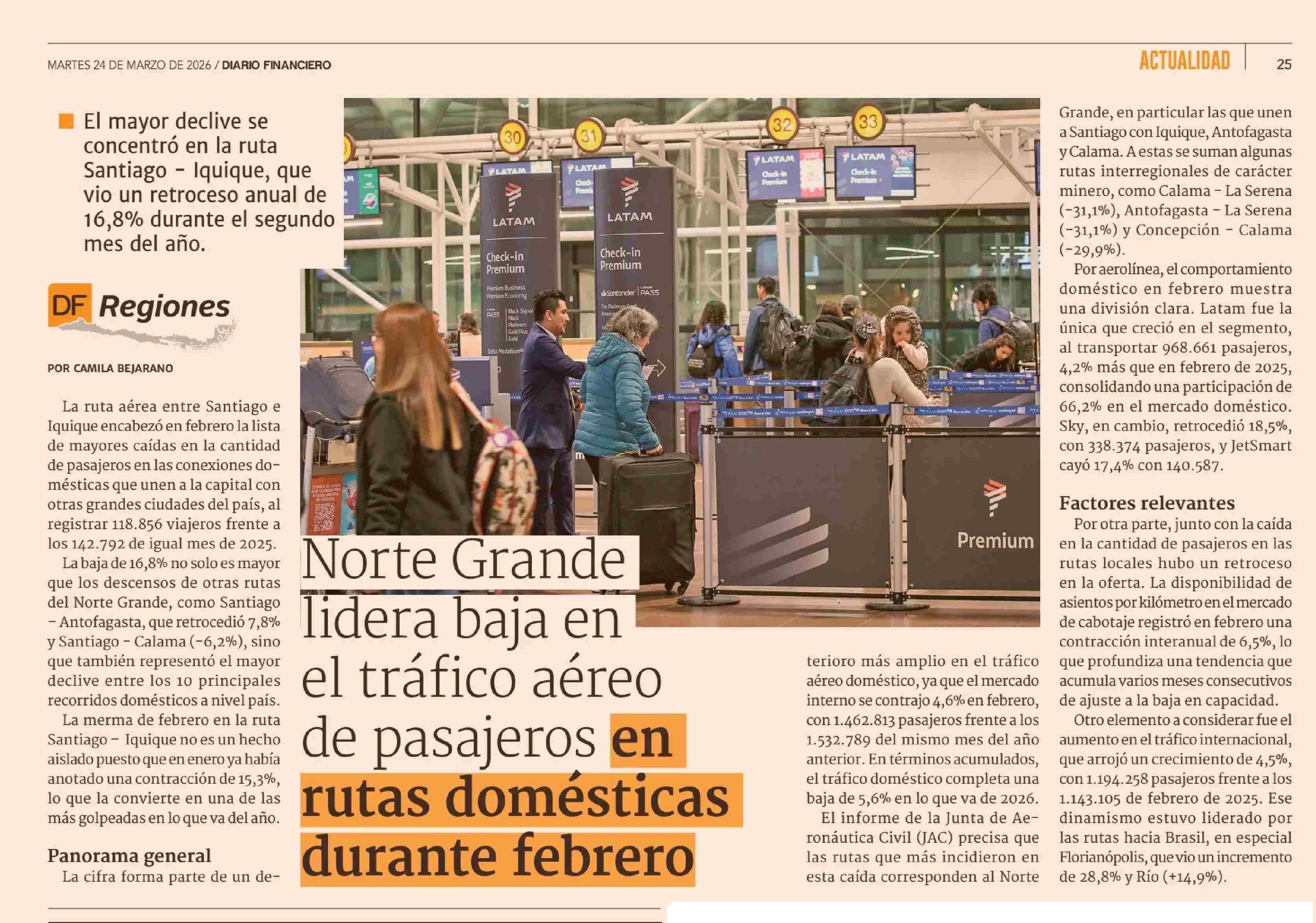 TS Norte Grande $ 2 lidera baja en == el tráfico aéreo de pasajeros en rutas domésticas durante febrero 24-03-2026 Diario Financiero |