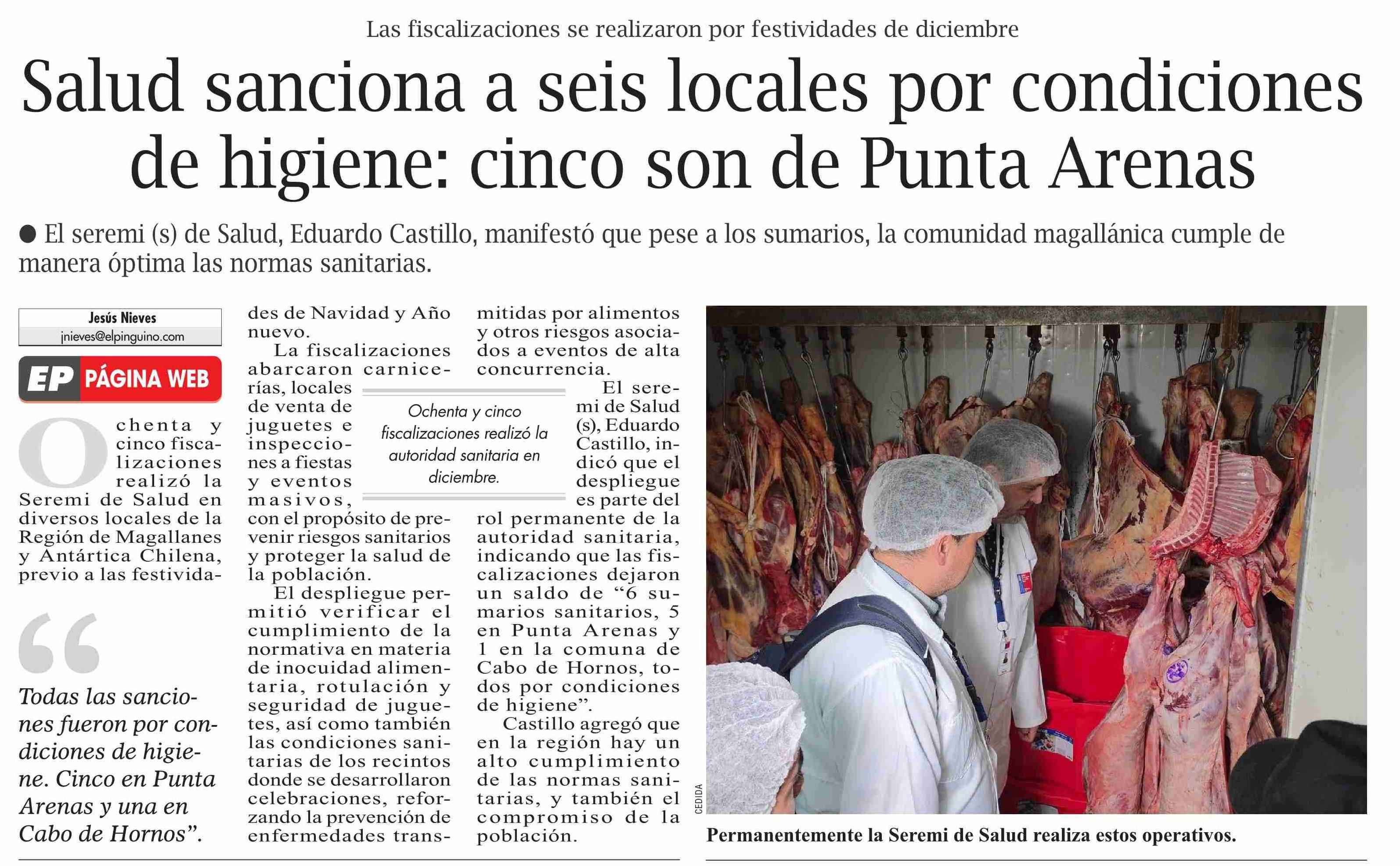 Salud sanciona a seis locales por condiciones de higiene: cinco son de Punta Arenas 08-01-2026 El Pingüino |