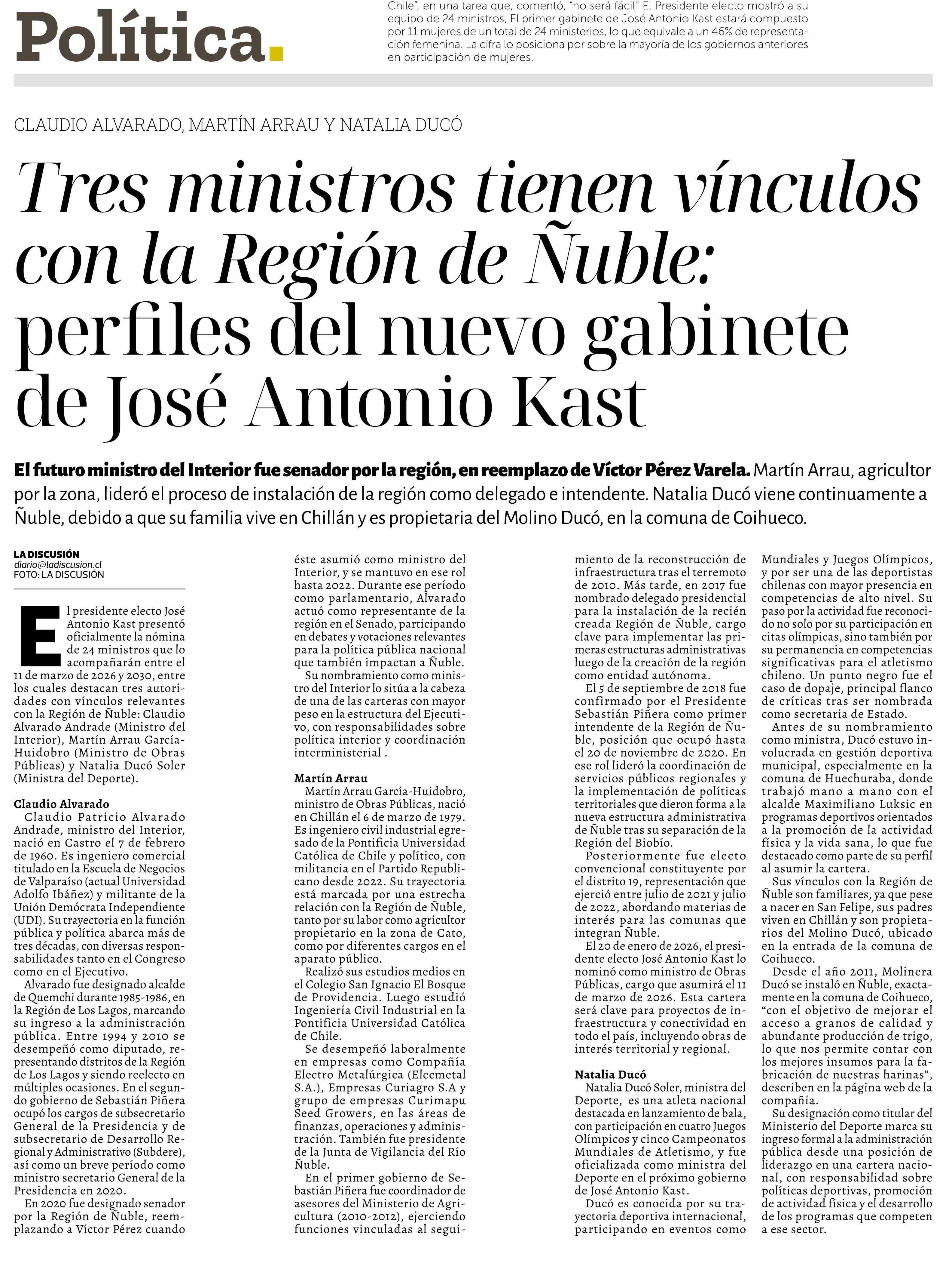 Título: Tres ministros tienen vínculos con la Región de Nuble: perfiles del nuevo gabinete de José Antonio Kast