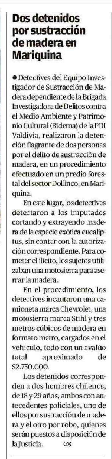 | Título: | Dos detenidos por sustracción de madera en Mariquina |
