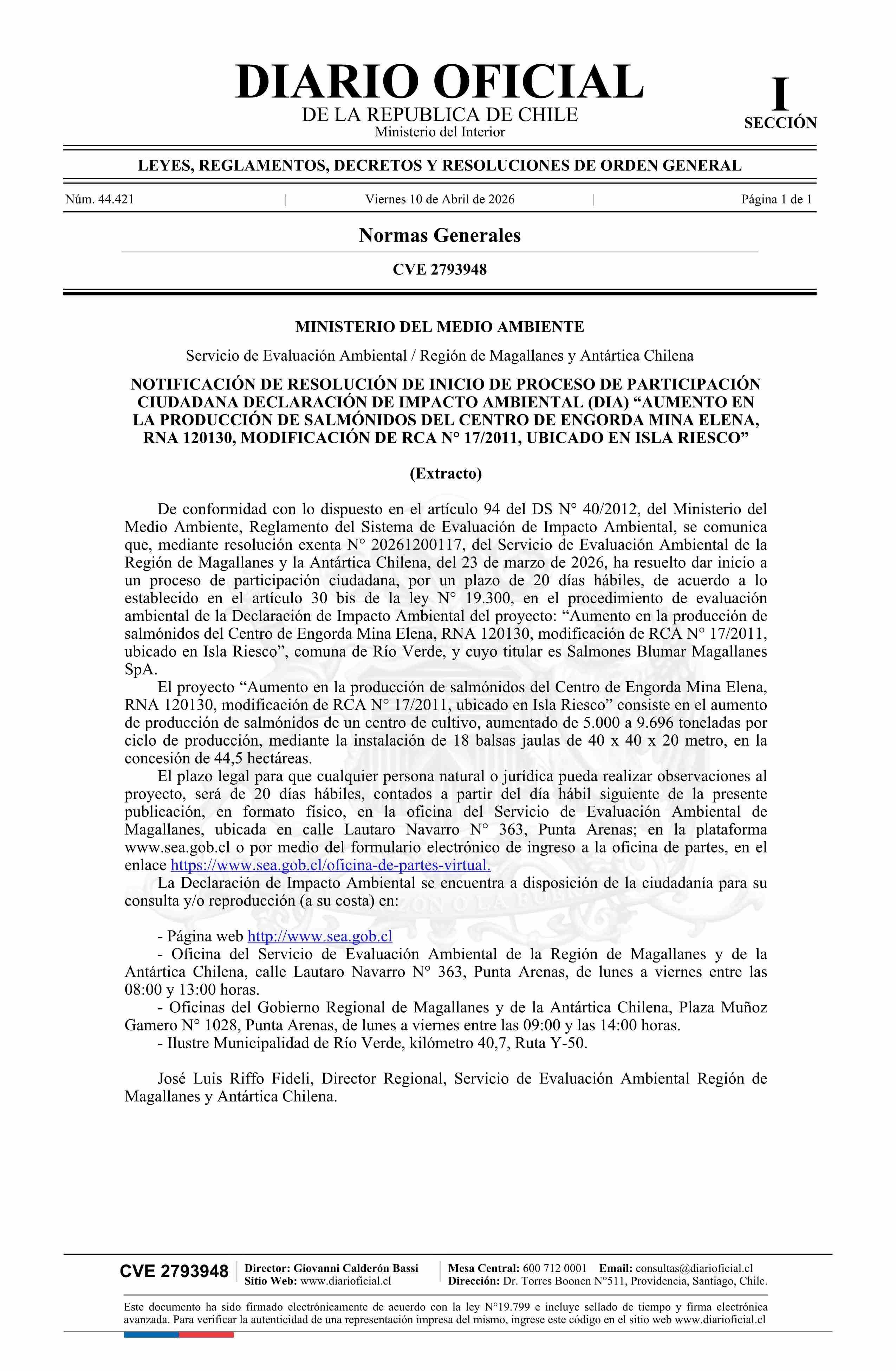 Título: Extracto de resolución exenta número 20261200117, de 2026.- Inicia proceso de participación ciudadana en Declaración de Impacto Ambiental del proyecto Aumento en la producción de salmónidos del Centro de Engorda Mina Elena