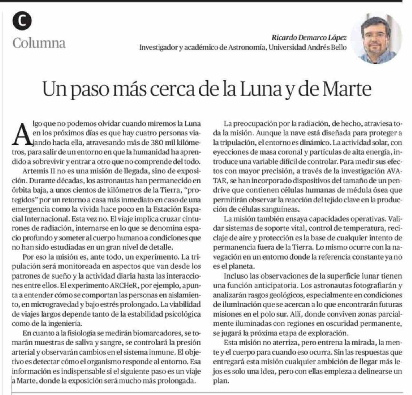 Columnas de Opinión: Un paso más cerca de la Luna y de Marte 04-04-2026 El Mercurio de Calama |