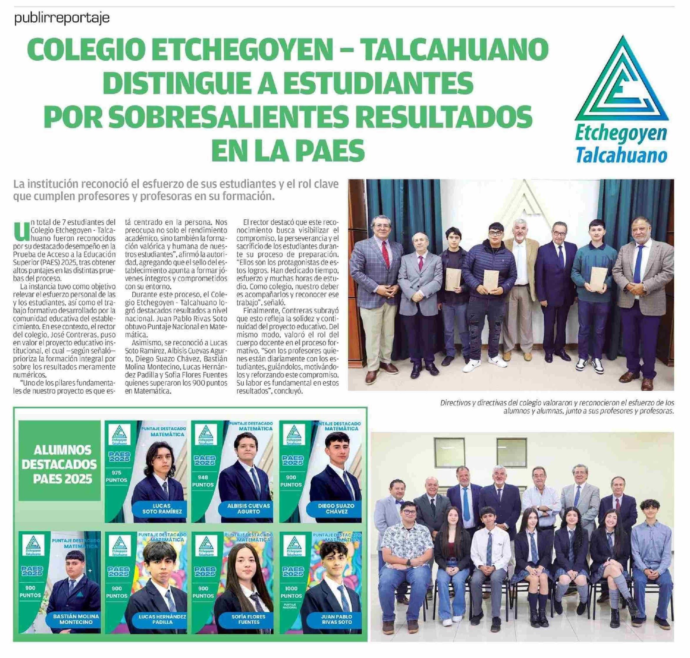 COLEGIO ETCHEGOYEN - TALCAHUANO DISTINGUE A ESTUDIANTES POR SOBRESALIENTES RESULTADOS EN LA PAES 18-01-2026 El Sur |