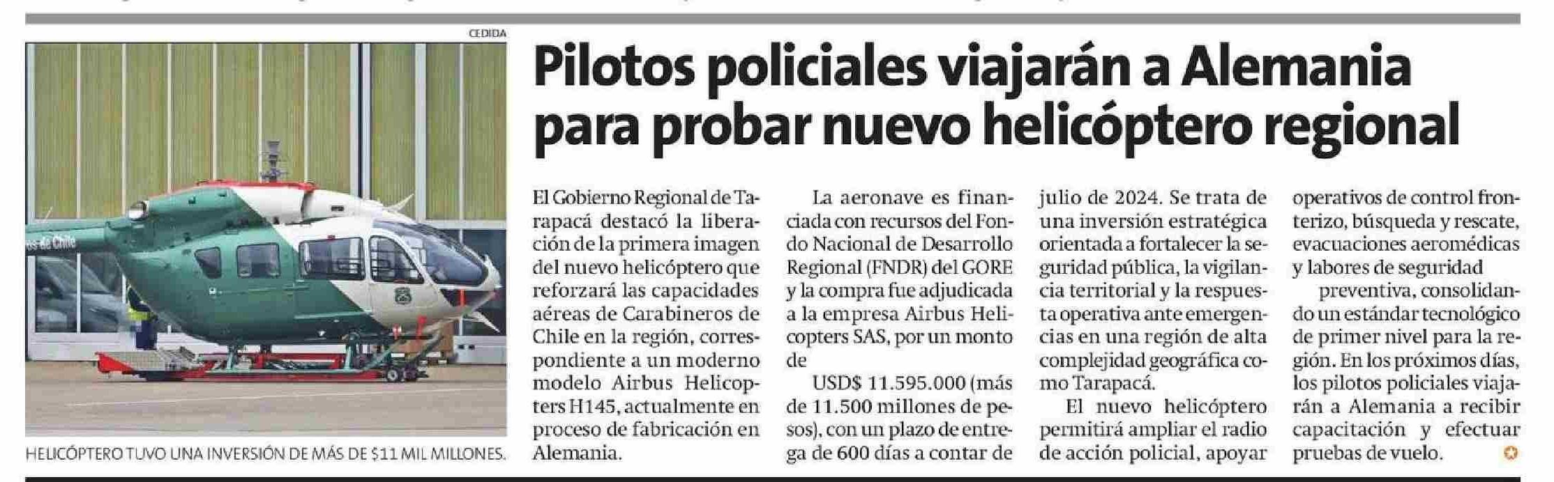 Pilotos policiales viajarán a Alemania para probar nuevo helicóptero regional 11-01-2026 La Estrella de Iquique |