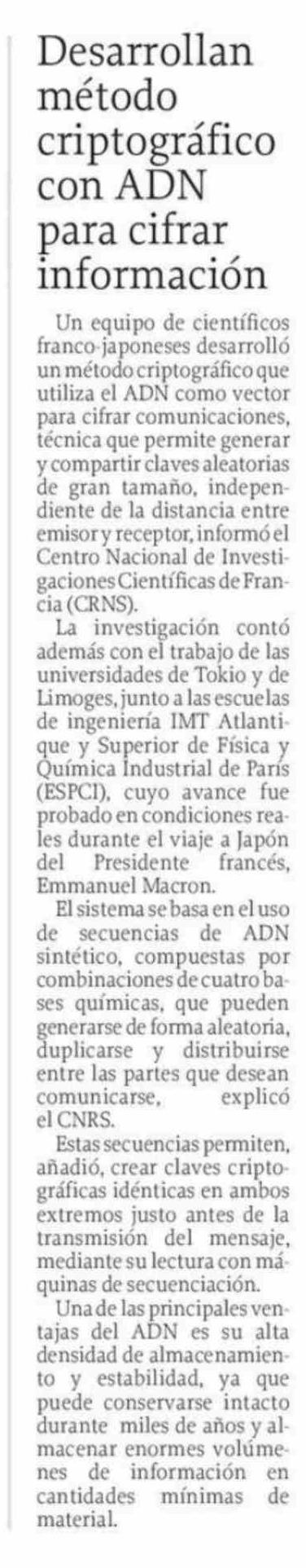 | Título: | Desarrollan método criptográfico con ADN para cifrar información |