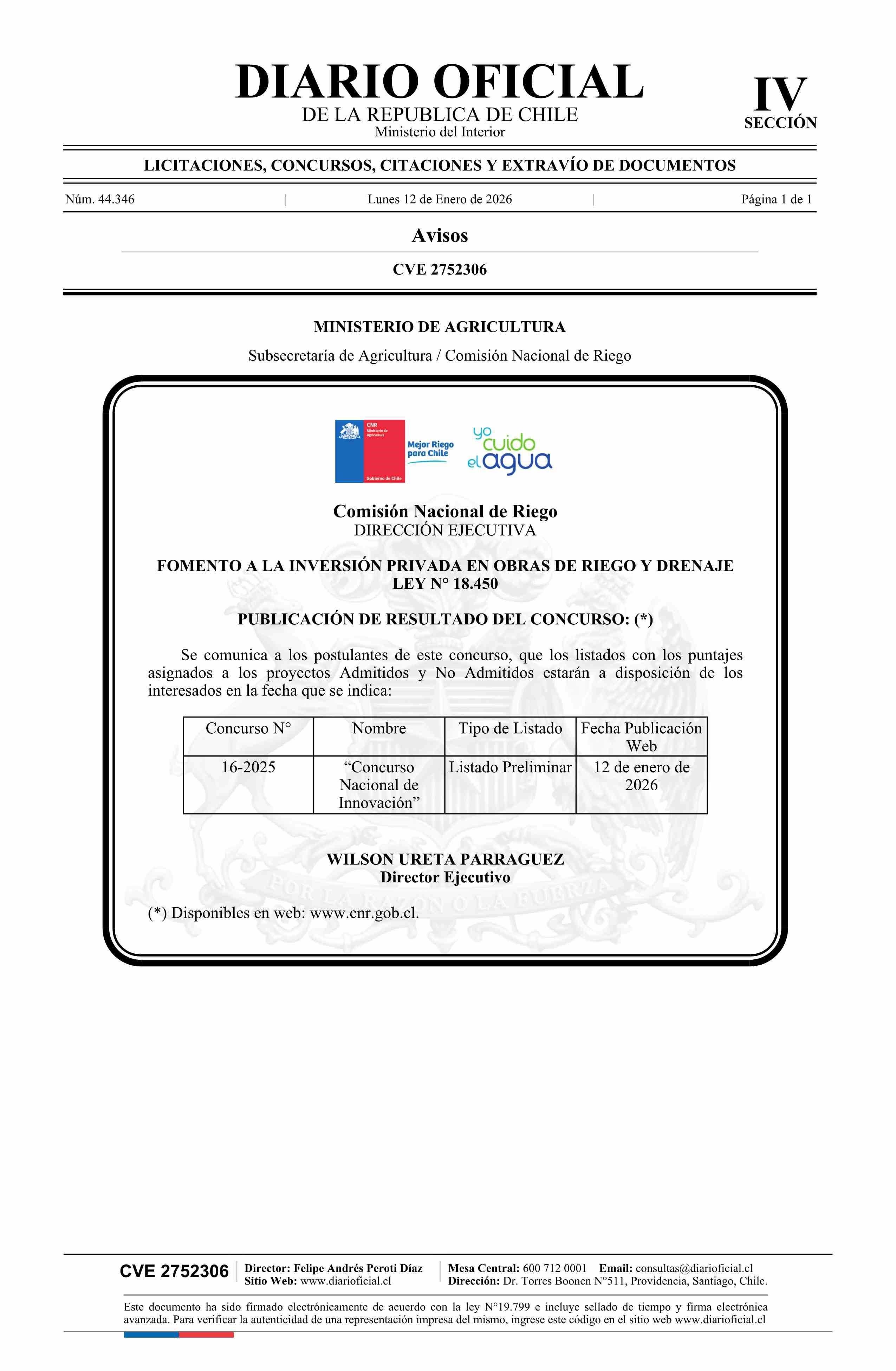 AVISO LICITACIONES: Fomento a la inversión privada en obras de riego y drenaje ley N° 18.450 12-01-2026 Diario Oficial Edición Electrónica |