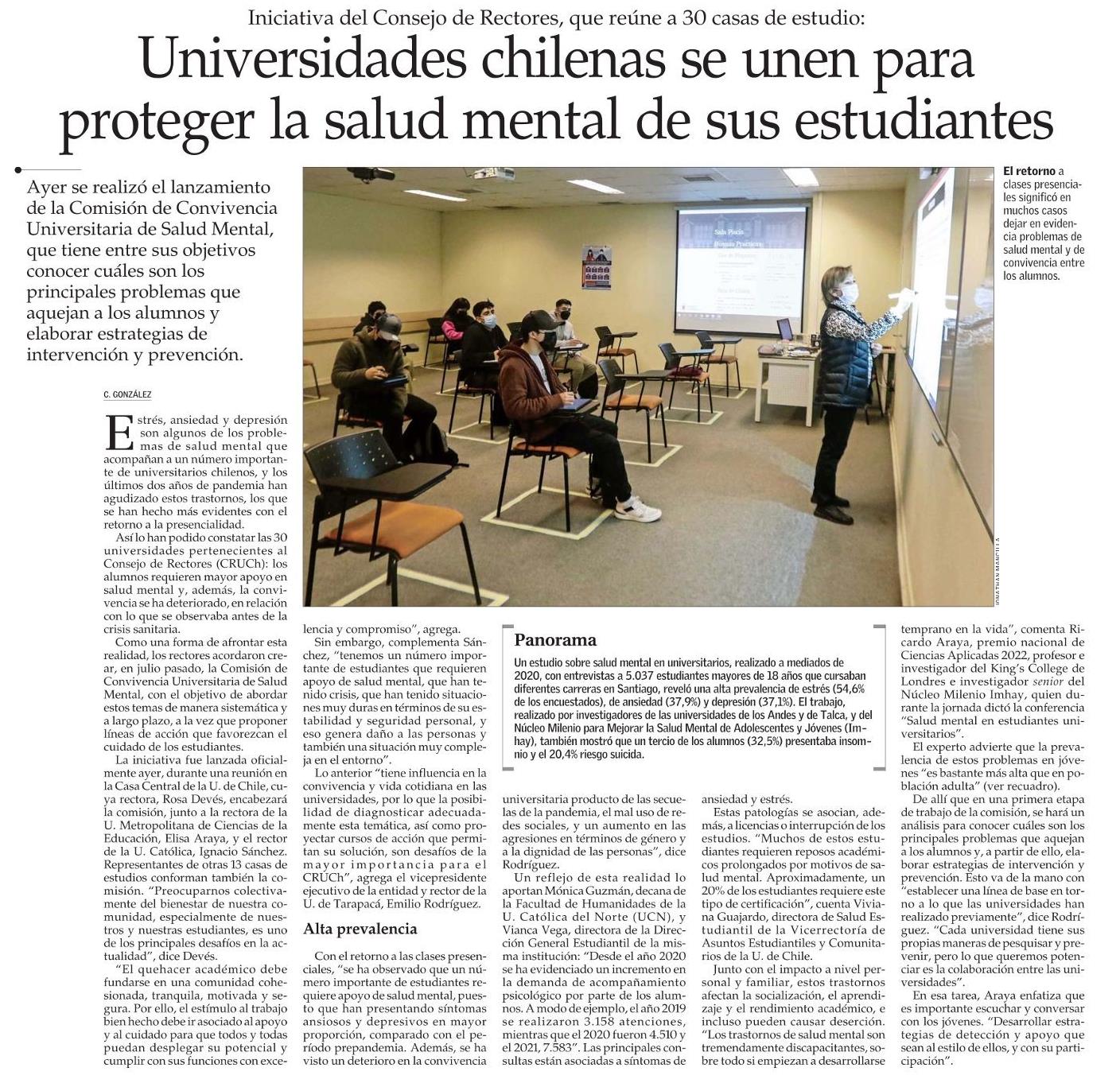 Universidades chilenas se unen para proteger la salud mental de sus estudiantes 03-11-2022 El Mercurio |