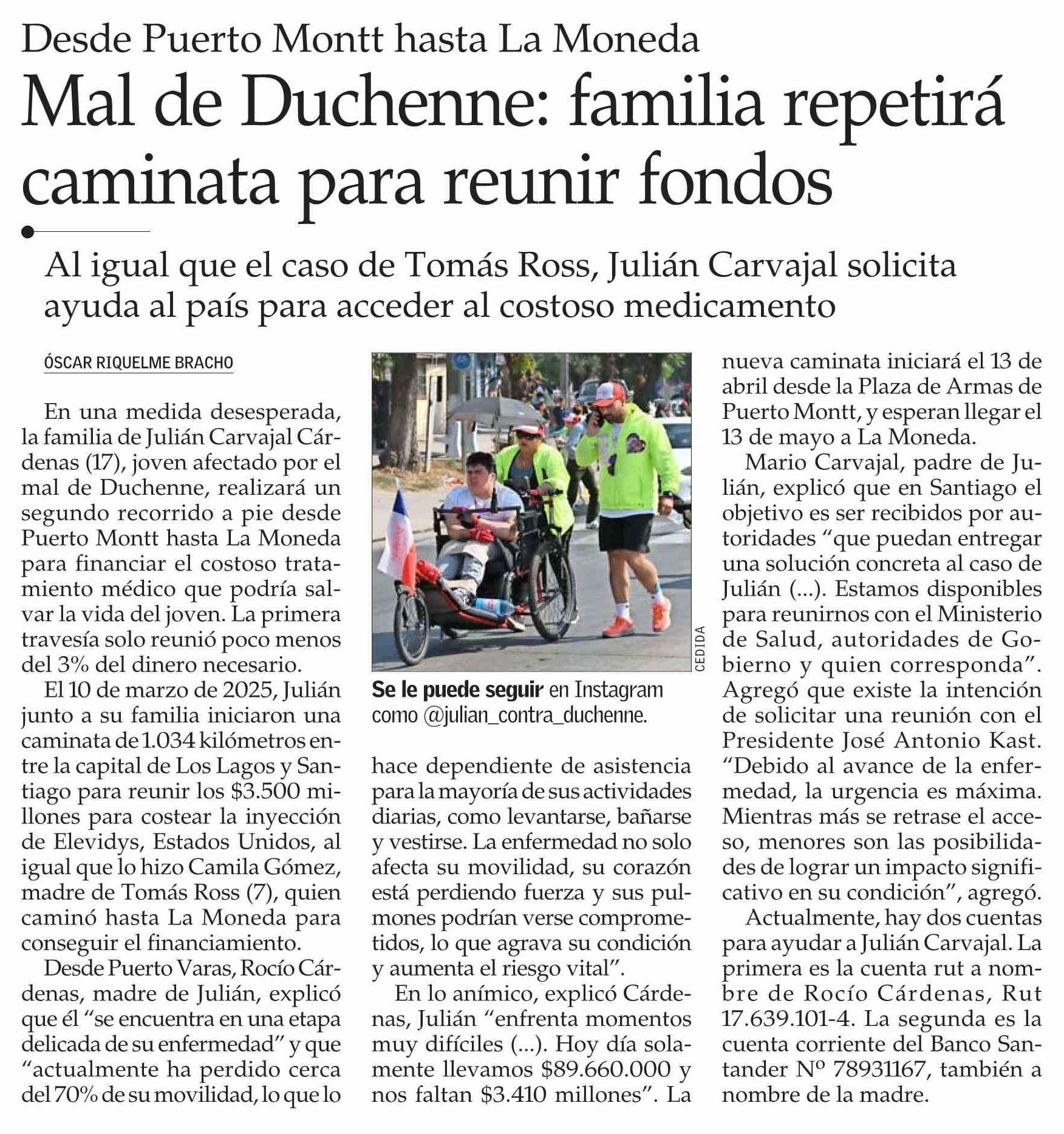 Mal de Duchenne: familia repetirá caminata para reunir fondos 13-04-2026 El Mercurio |