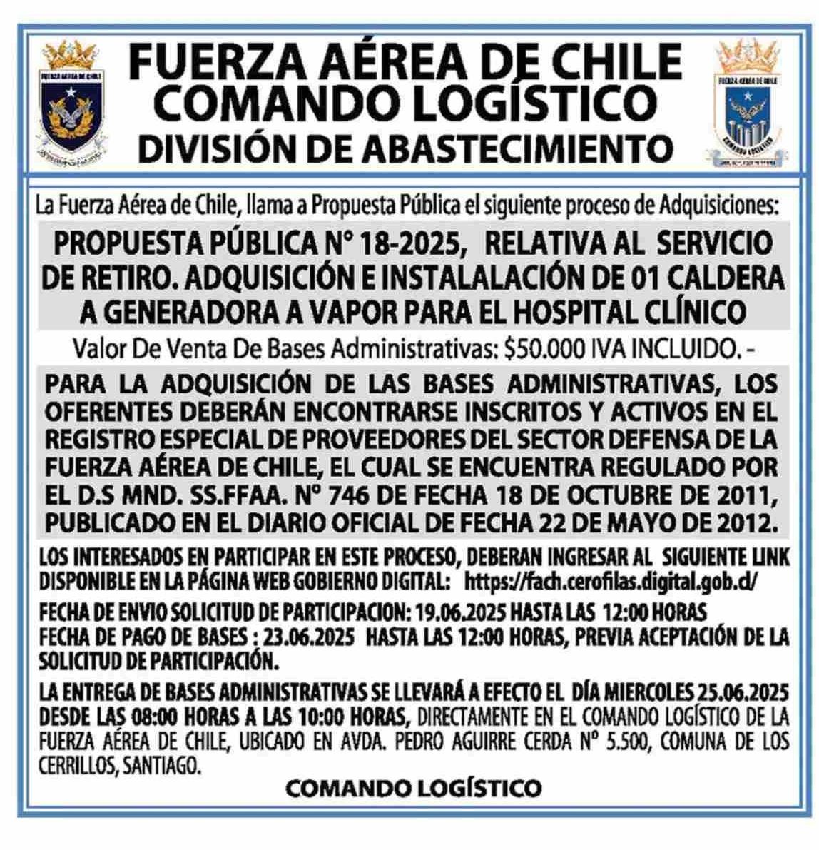 AVISO LICITACIONES: FUERZA AÉREA DE CHILE COMANDO LOGÍSTICO DIVISIÓN DE ABASTECIMIENTO 17-06-2025 Las Últimas Noticias |