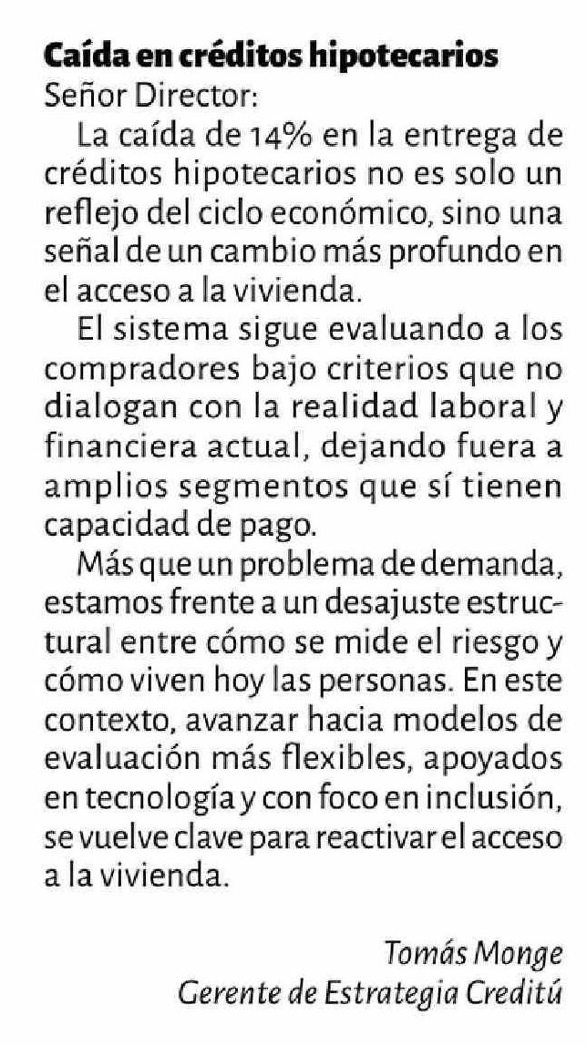 Cartas: Caída en créditos hipotecarios 22-04-2026 La Discusión |