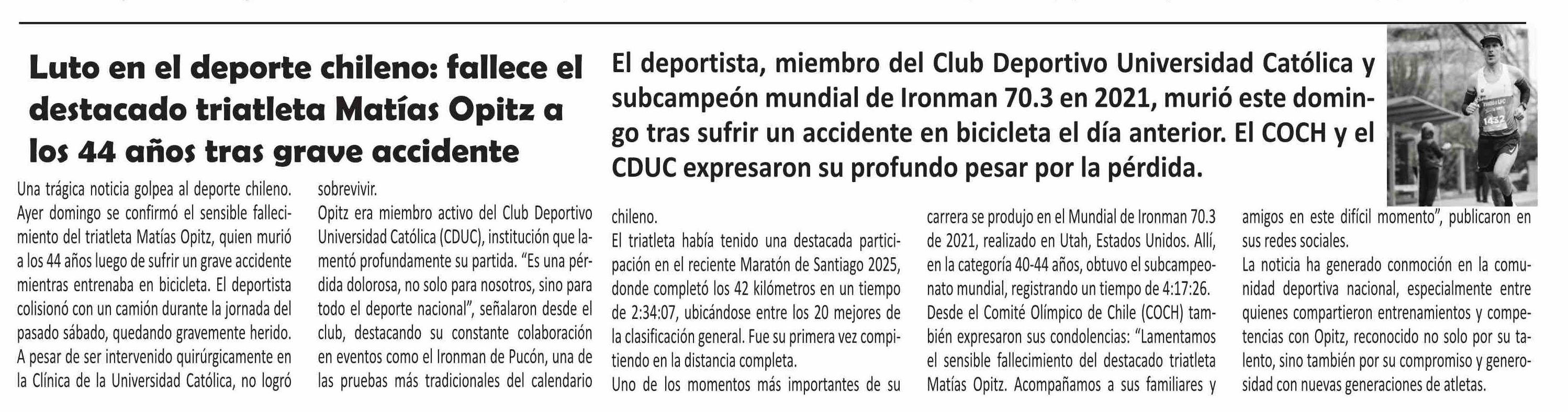| Título: | Luto en el deporte chileno: fallece el destacado triatleta Matías Opitz a los 44 años tras grave accidente |
