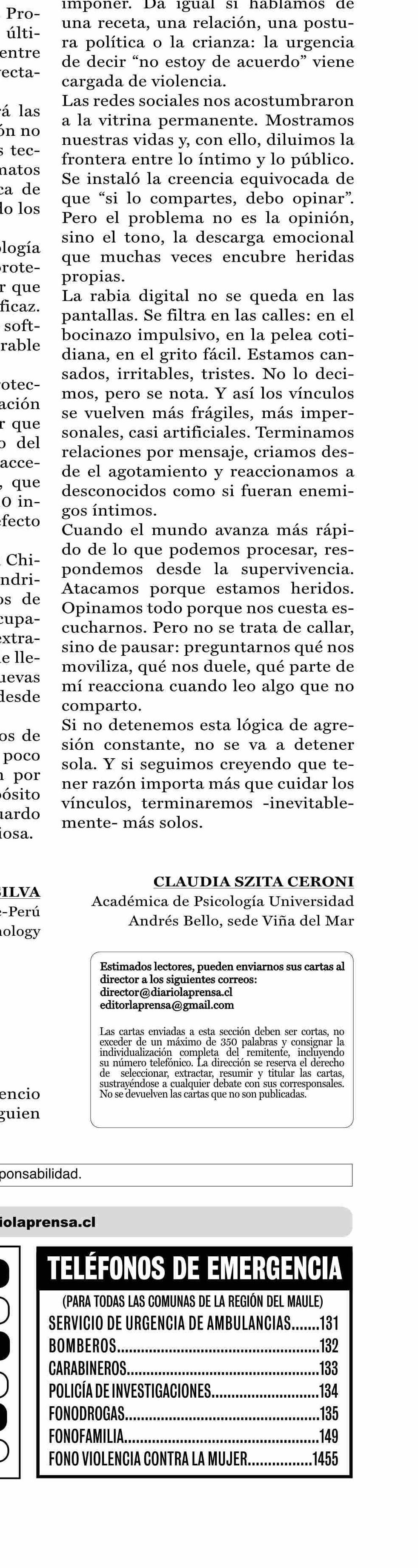 Cartas: La violencia de opinar de todo 28-01-2026 La Prensa de Curicó |