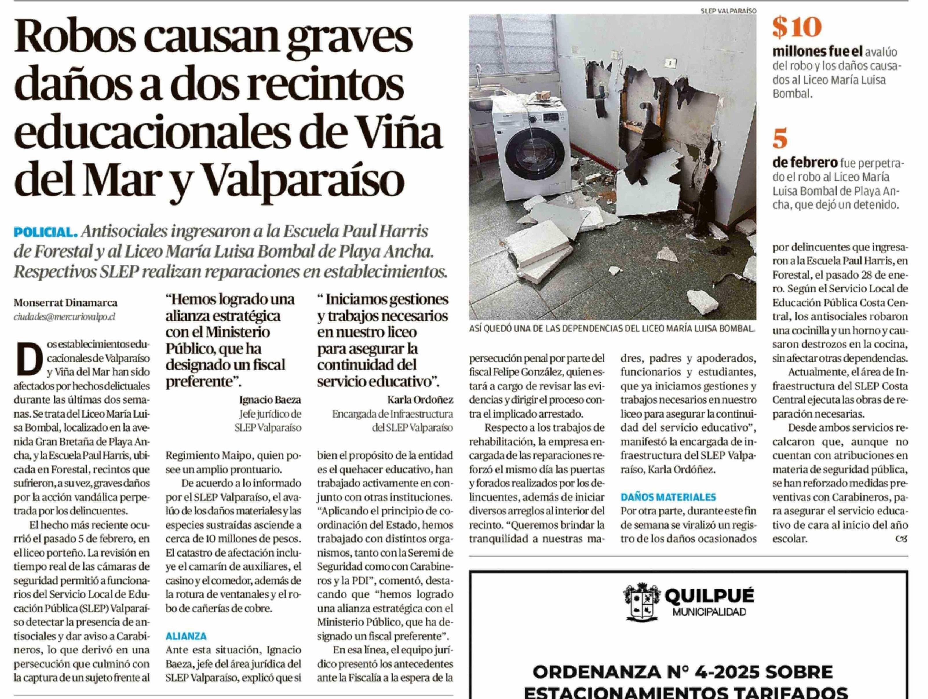 Robos causan graves daños a dos recintos educacionales de Viña del Mar y Valparaíso 09-02-2026 El Mercurio de Valparaíso |