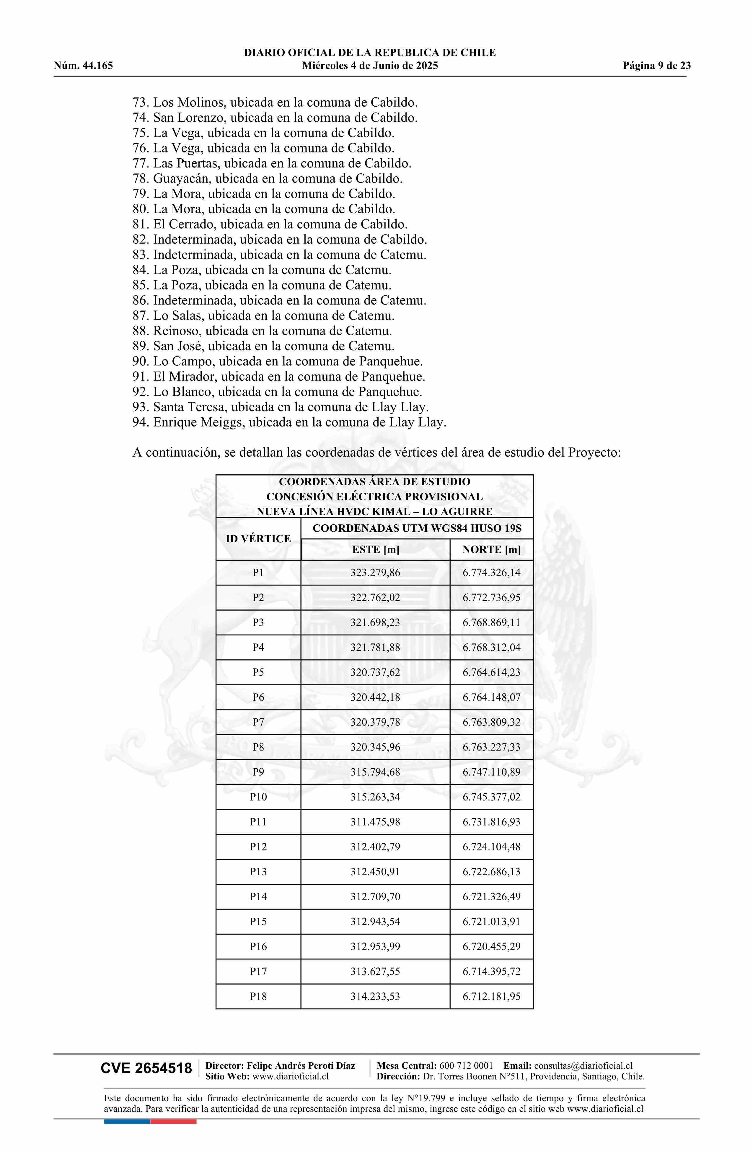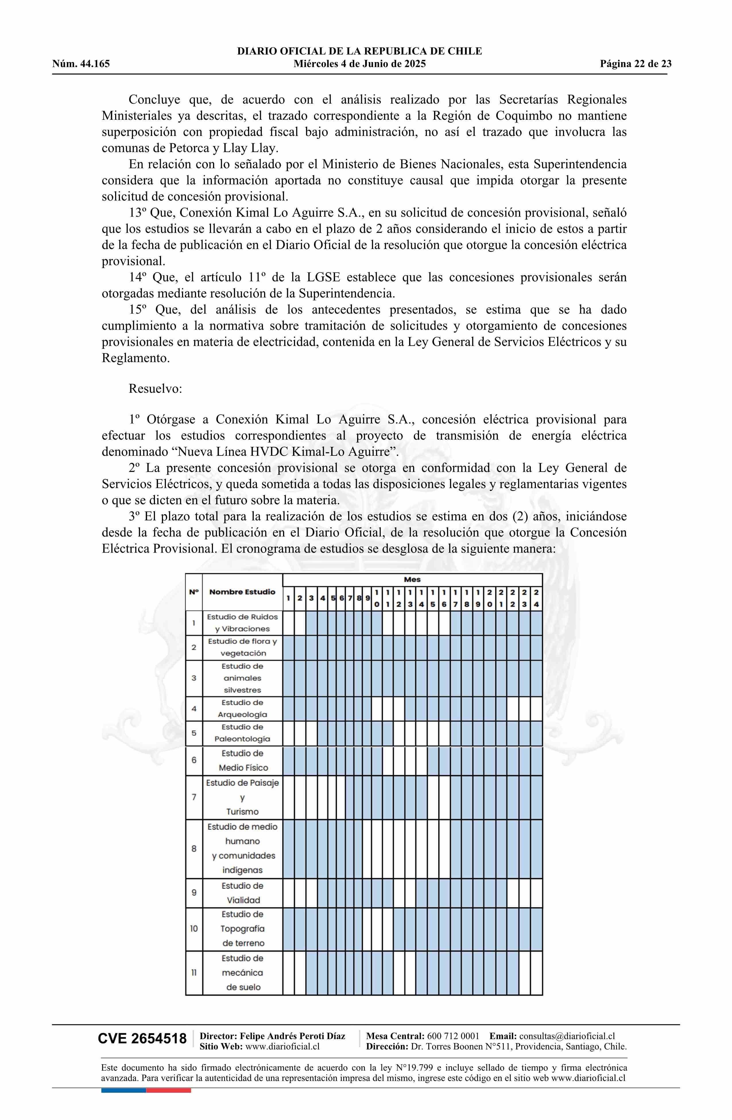 | Título: | Resolución exenta número 32.307, de 2025.- Otorga a conexión Kimal Lo Aguirre S.A. concesión provisional para Proyecto de Transmisión de Energía Eléctrica denominado Nueva Línea HVDC Kimal - Lo Aguirre |