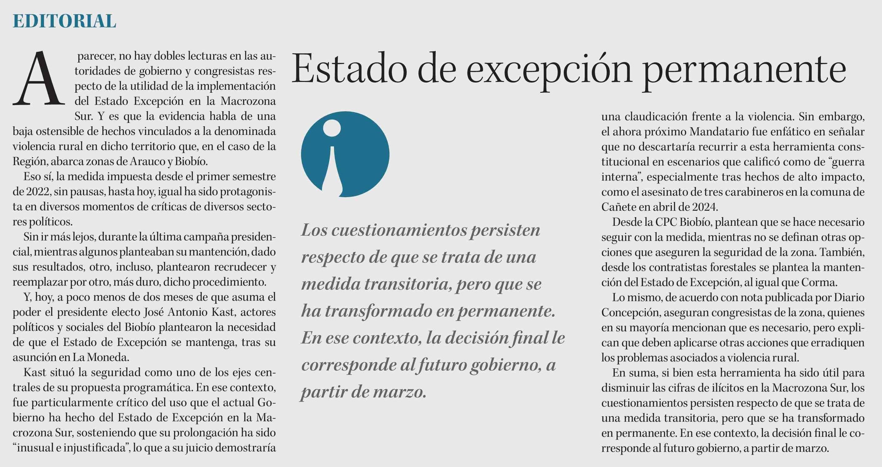 Editorial: Estado de excepción permanente 14-01-2026 Diario Concepción |