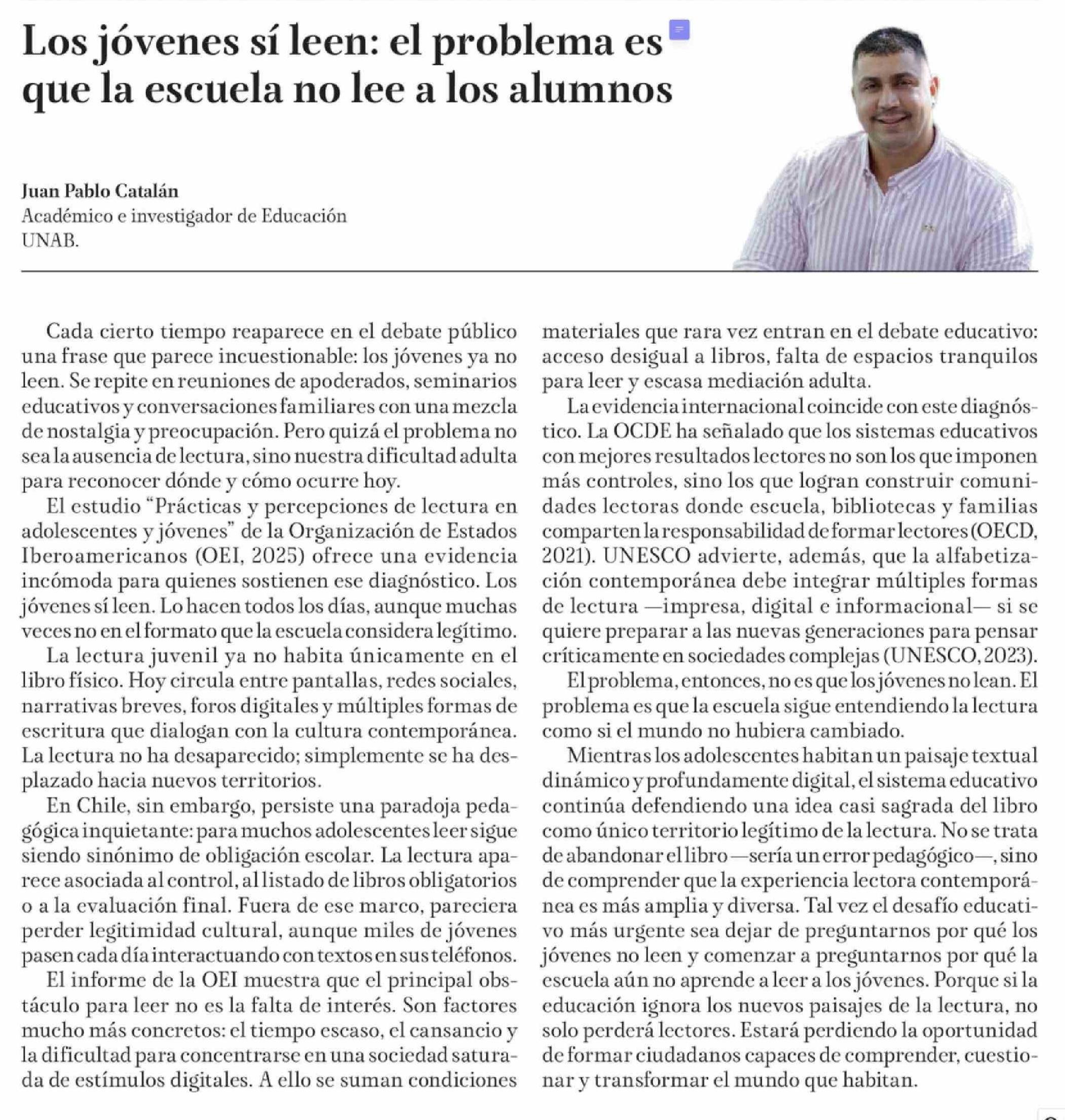 Columnas de Opinión: Los jóvenes sí leen: el problema es que la escuela no lee a los alumnos 25-03-2026 La Tribuna |
