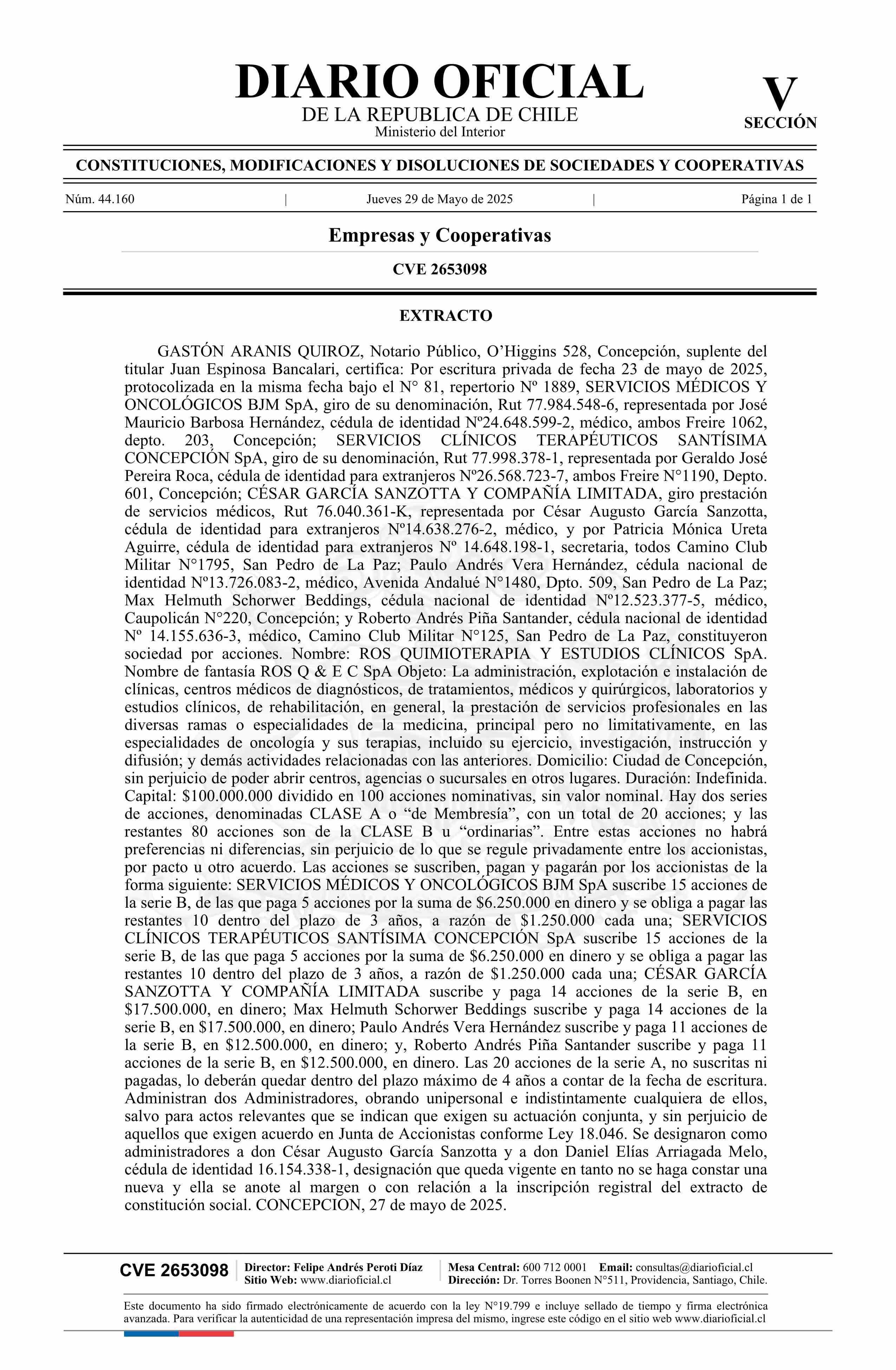 ROS QUIMIOTERAPIA Y ESTUDIOS CLÍNICOS SpA 29-05-2025 Diario Oficial Edición Electrónica |
