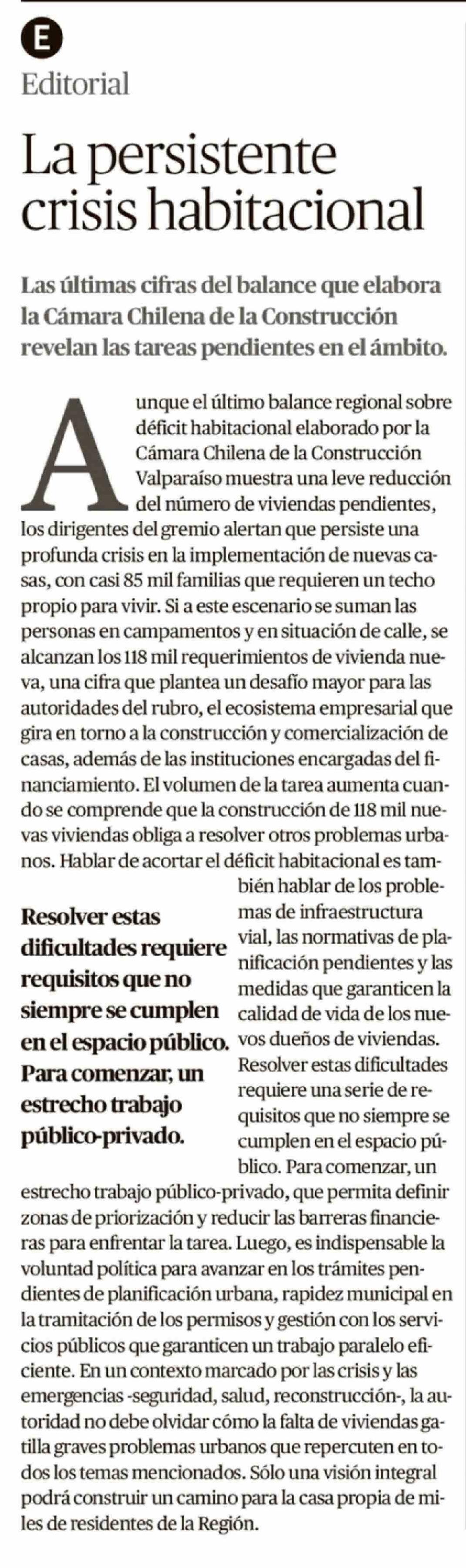 Editorial: La persistente crisis habitacional 23-04-2026 El Mercurio de Valparaíso |