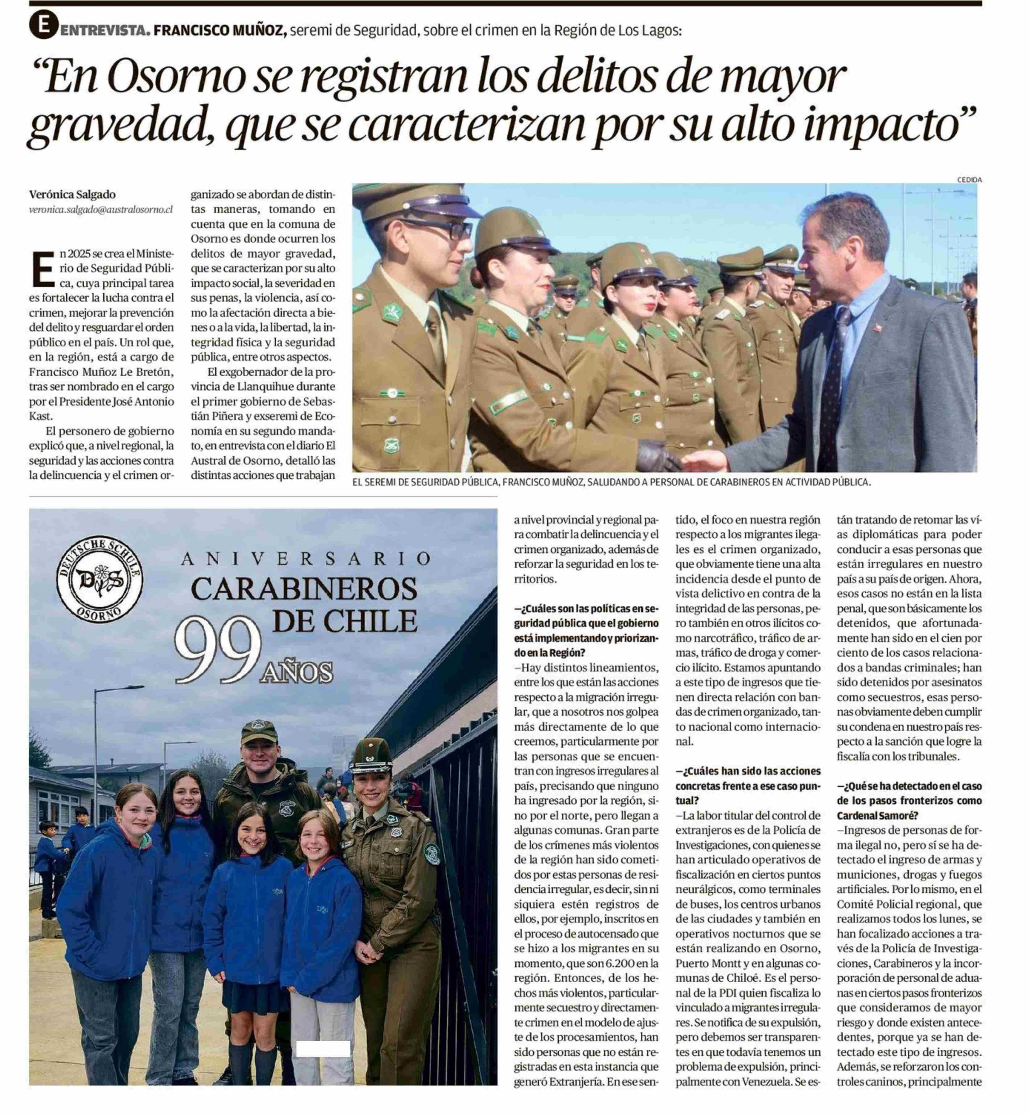 "En Osorno se registran los delitos de mayor gravedad, que se caracterizan por su alto impacto" 27-04-2026 El Austral de Osorno |