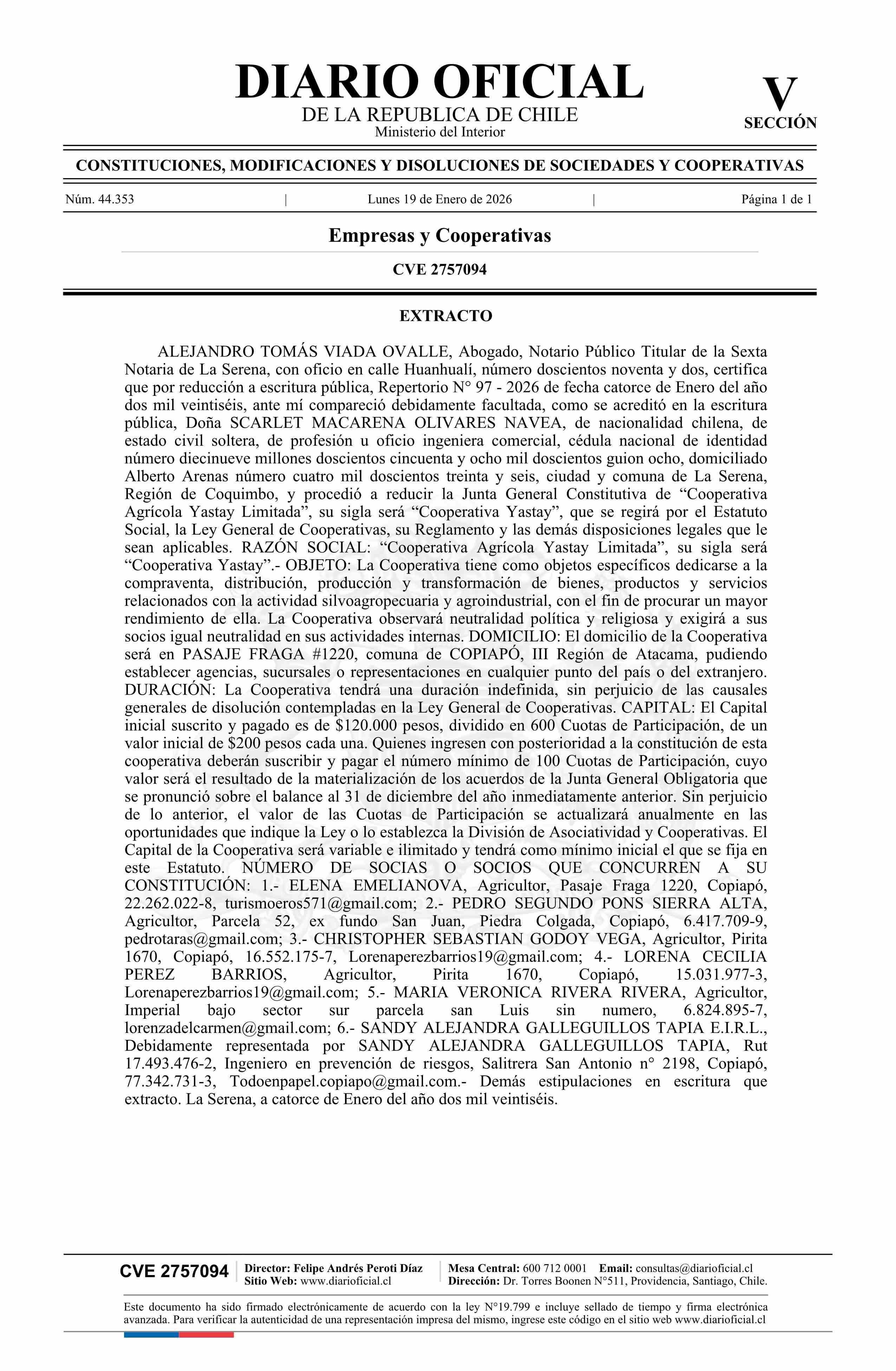 Cooperativa Agrícola Yastay Limitada 19-01-2026 Diario Oficial Edición Electrónica |
