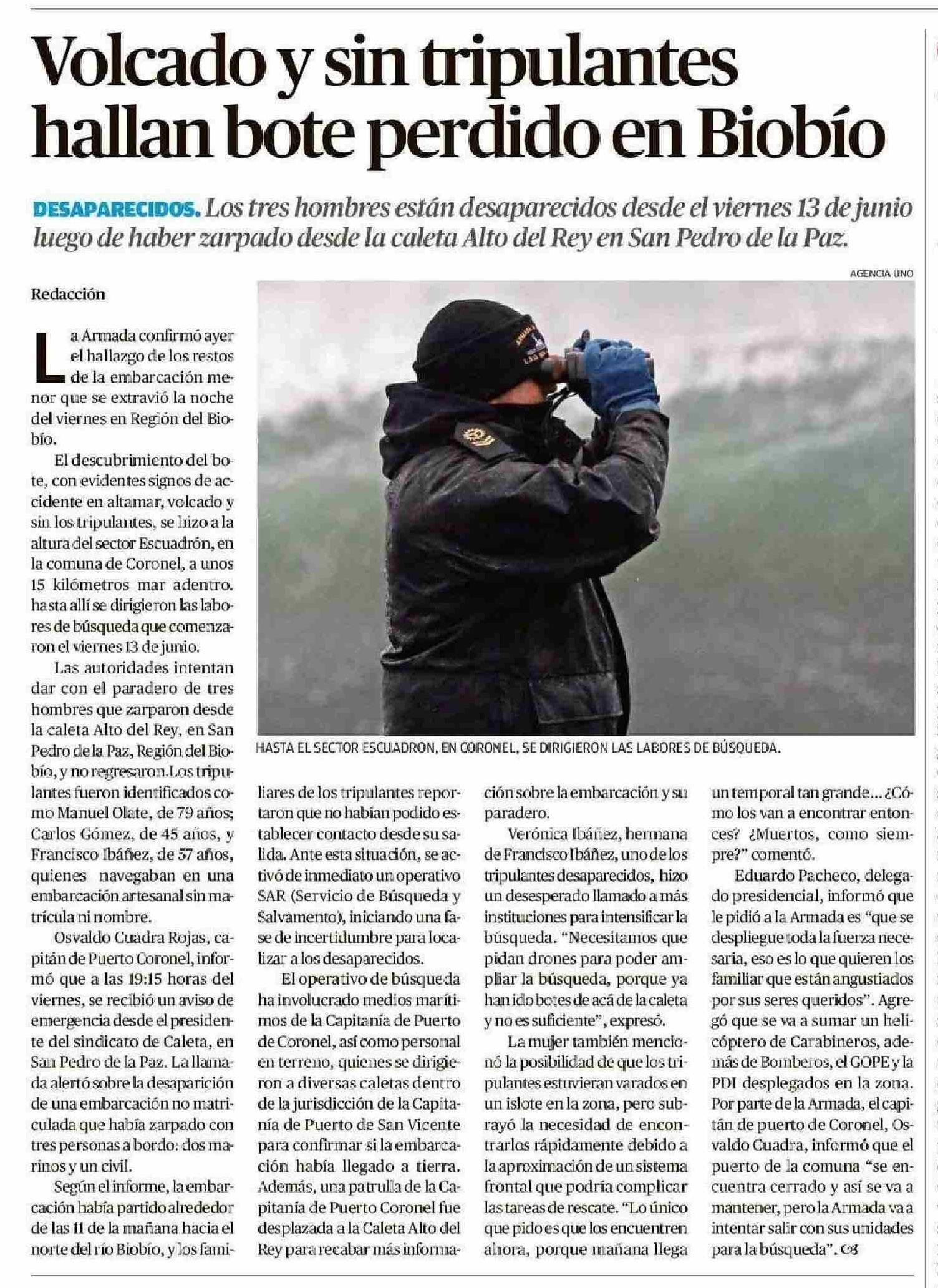 | Título: | Volcado y sin tripulantes hallan bote perdido en Biobío |