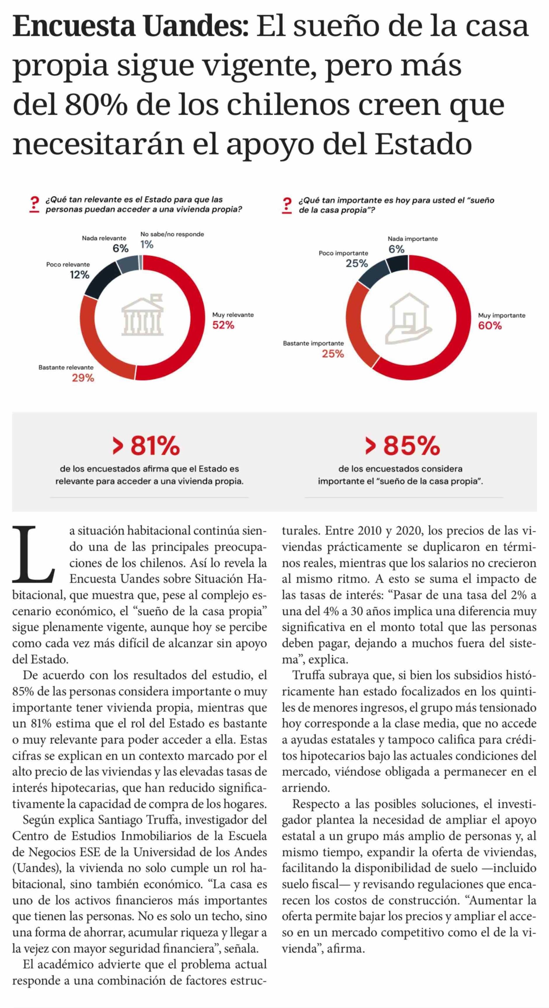 | Título: | Encuesta Uandes: El sueño de la casa propia sigue vigente, pero más del 80% de los chilenos creen que necesitarán el apoyo del Estado |