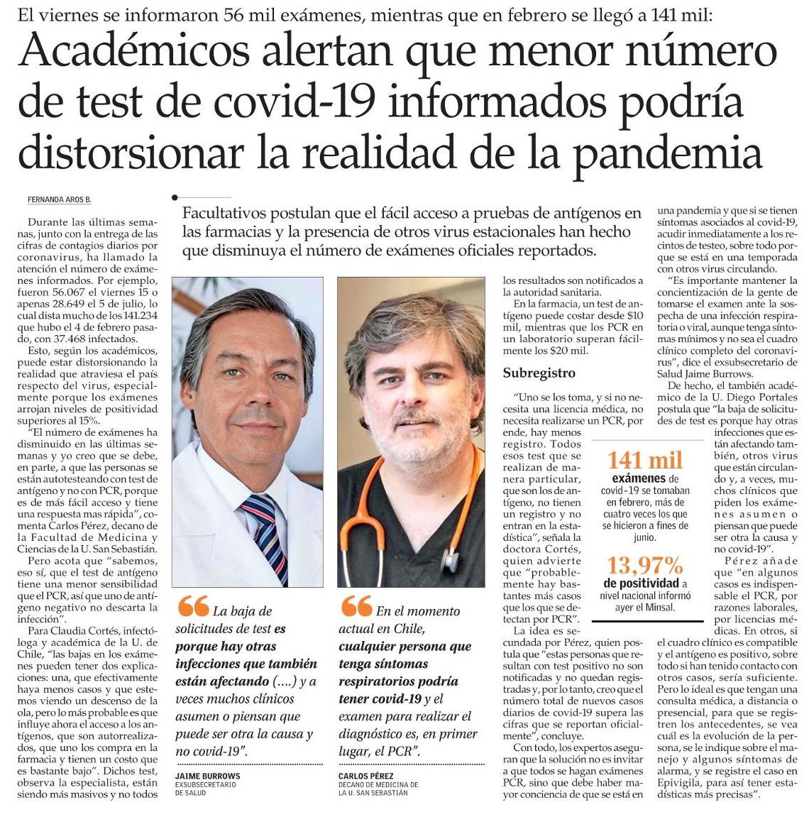 Académicos alertan que menor número de test de covid-19 informados podría distorsionar la realidad de la pandemia 17-07-2022 El Mercurio |