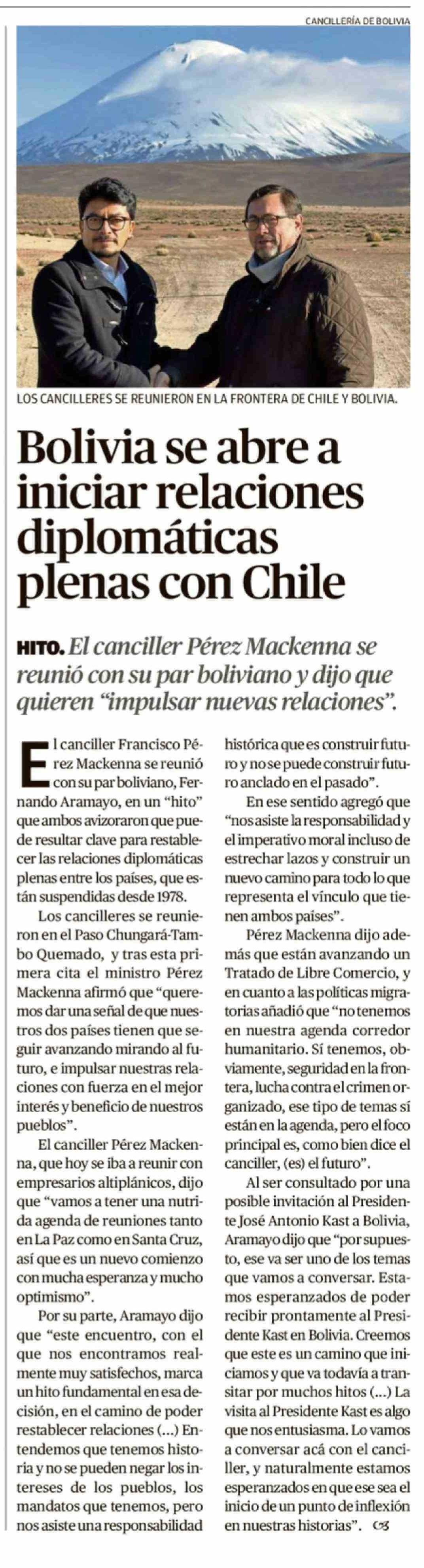 | Título: | Bolivia se abre a iniciar relaciones diplomáticas plenas con Chile |