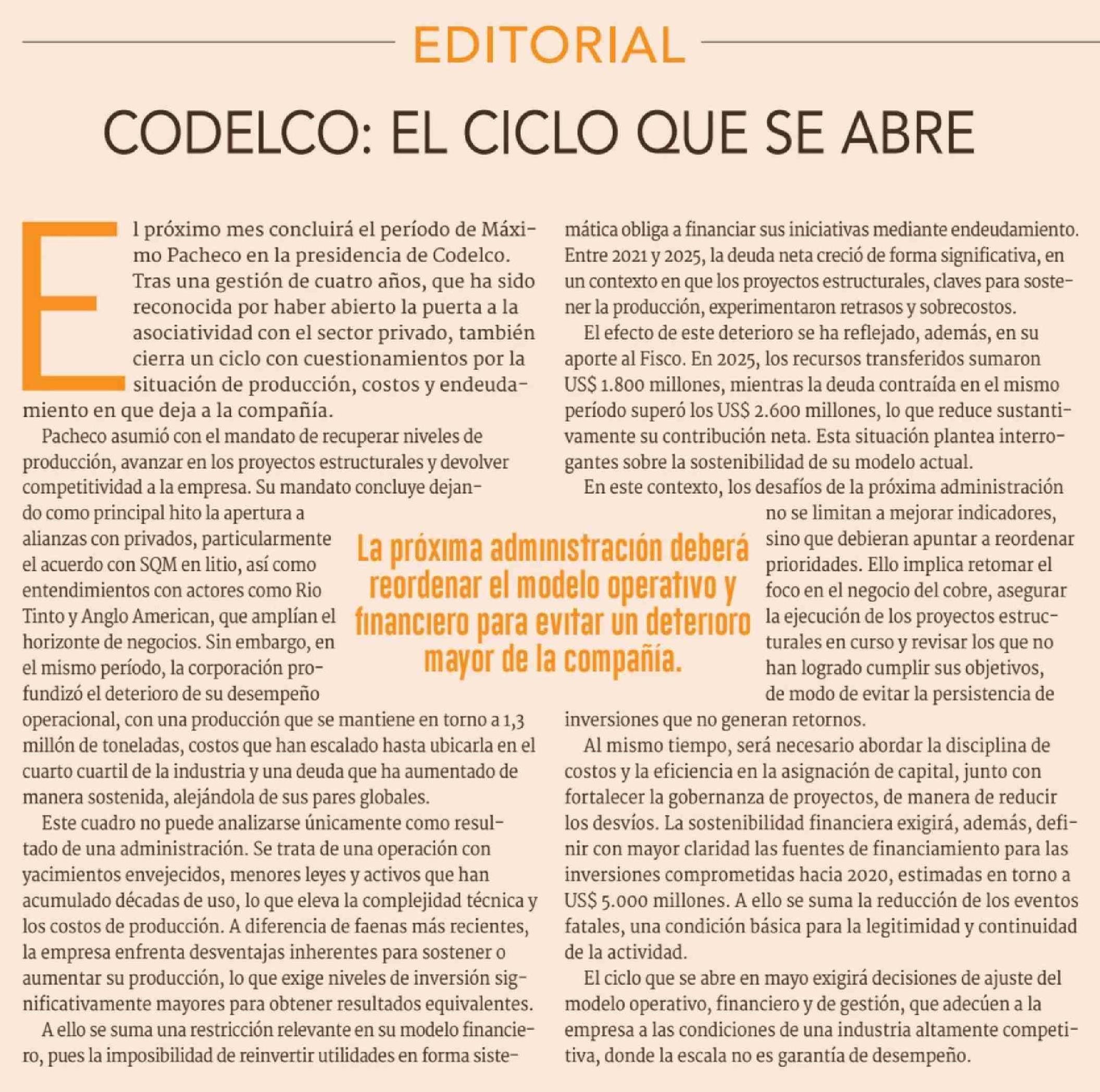 Editorial: CODELCO: EL CICLO QUE SE ABRE 07-04-2026 Diario Financiero |