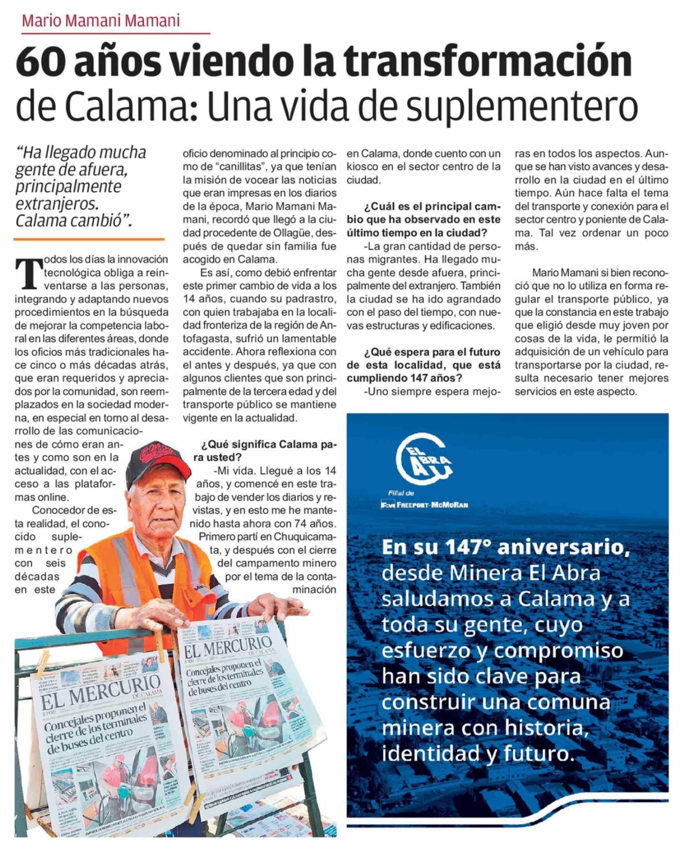 60 Años viendo la transformación de Calama: Una vida de suplementero 30-03-2026 El Mercurio de Calama |