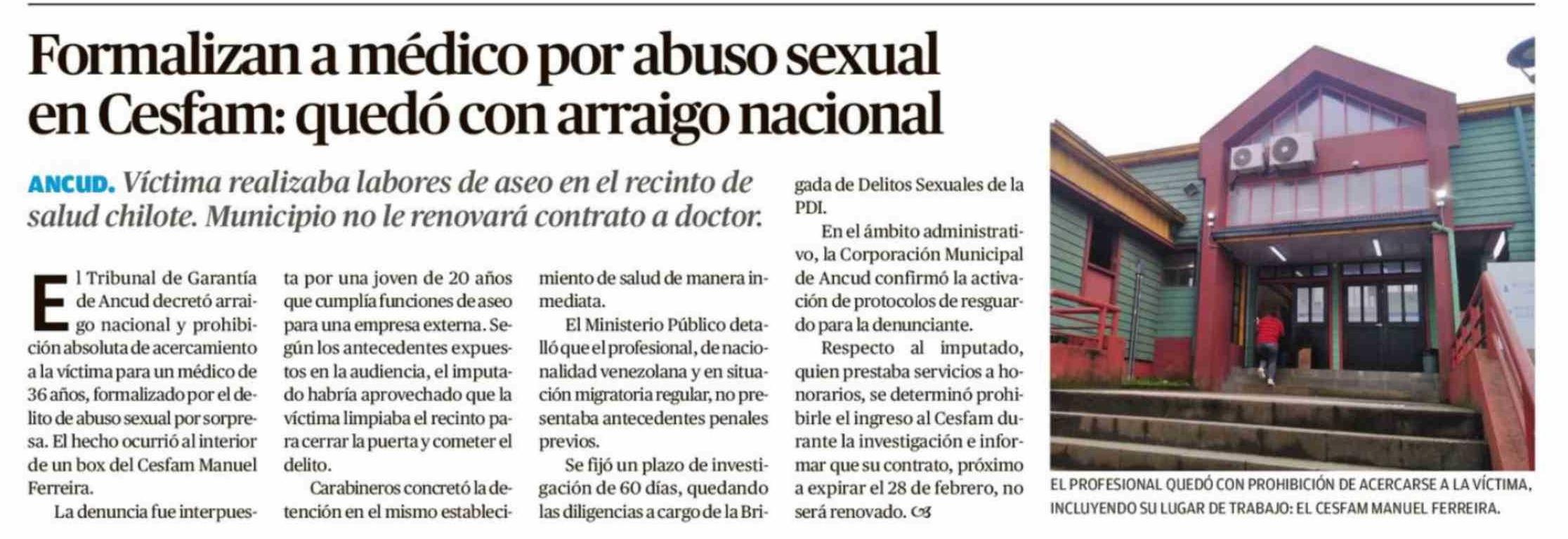 Formalizan a médico por abuso sexual en Cesfam: quedó con arraigo nacional 19-02-2026 El Llanquihue |