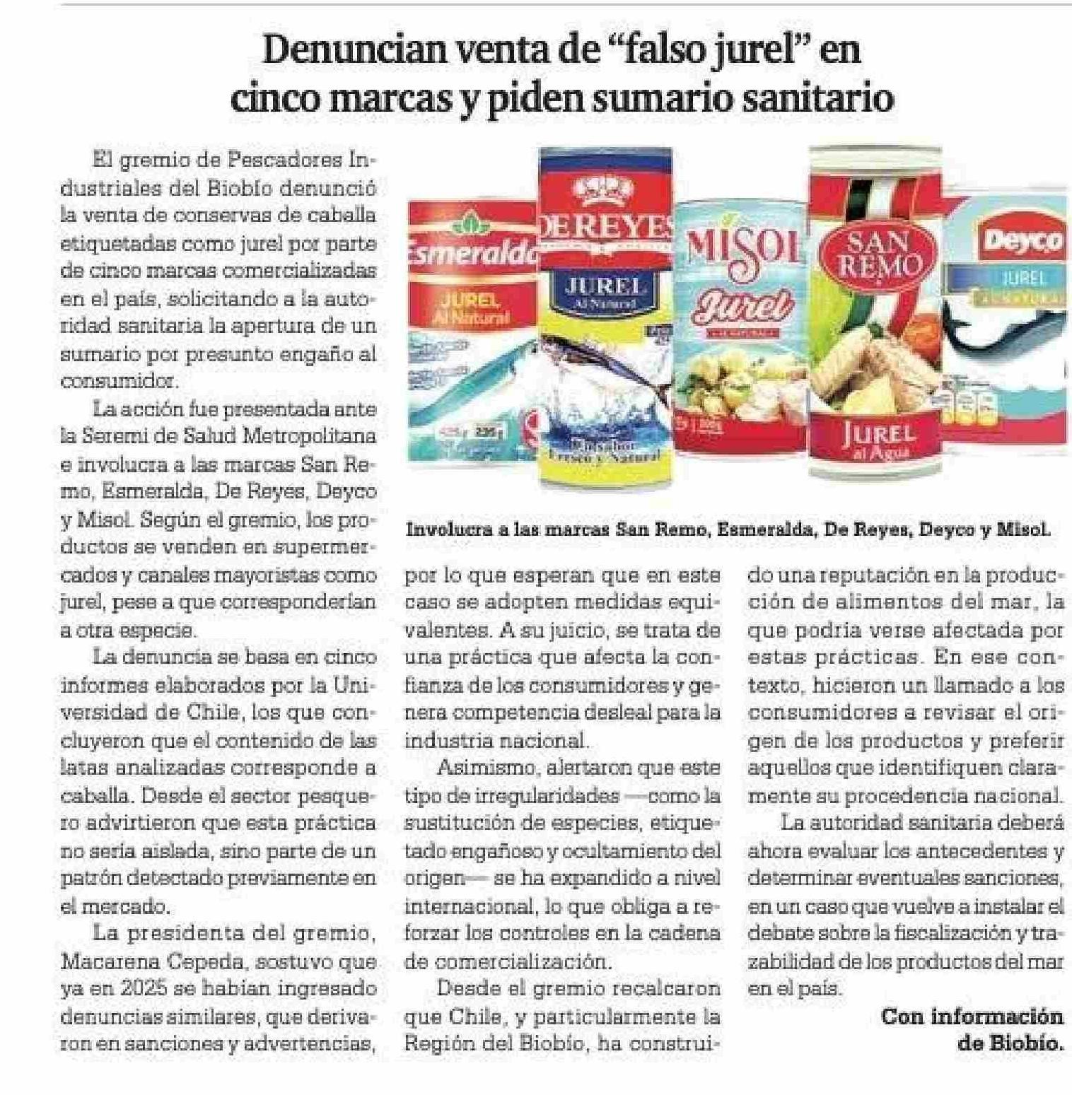 Denuncian venta de “falso jurel” en cinco marcas y piden sumario sanitario 06-04-2026 La Prensa Austral |